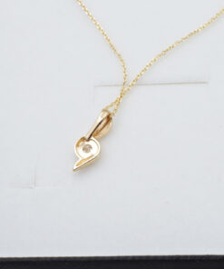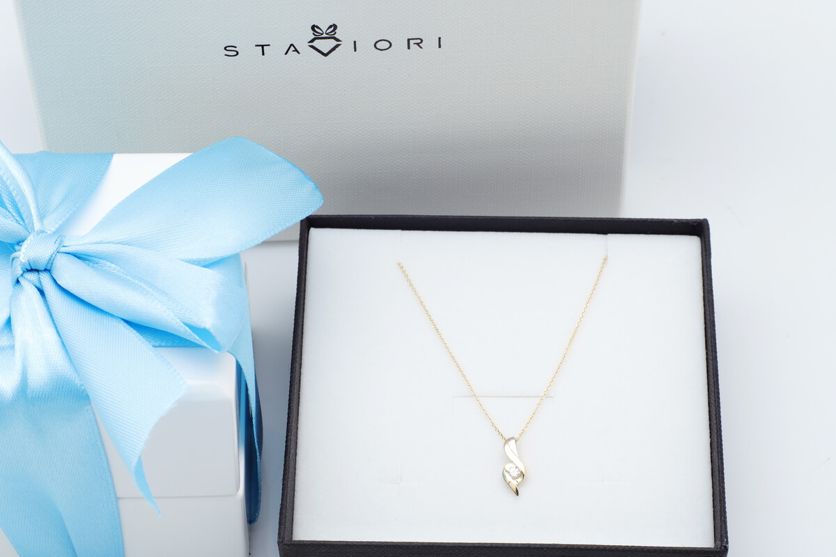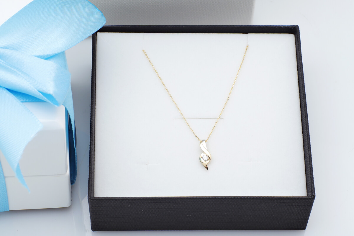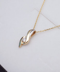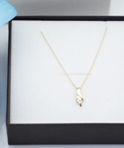 Subtelny wisiorek z żółtego złota 0,585 zachwyca delikatnym kształtem przypominającym wir światła. W jego centrum lśni brylant o masie 0,08 ct, który dodaje całości wyjątkowego blasku i elegancji. Połączenie miękkich linii i ponadczasowego złota tworzy biżuterię pełną wdzięku – idealną zarówno na co dzień, jak i na szczególne okazje.