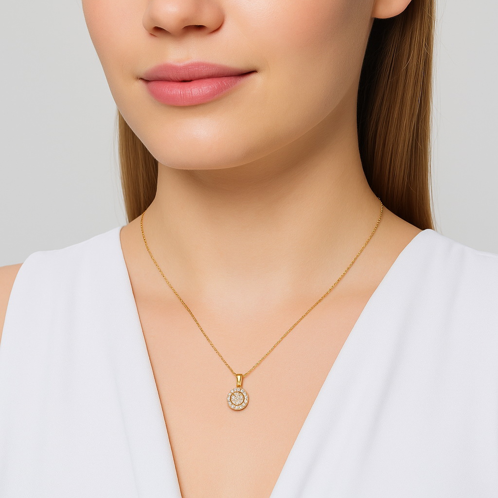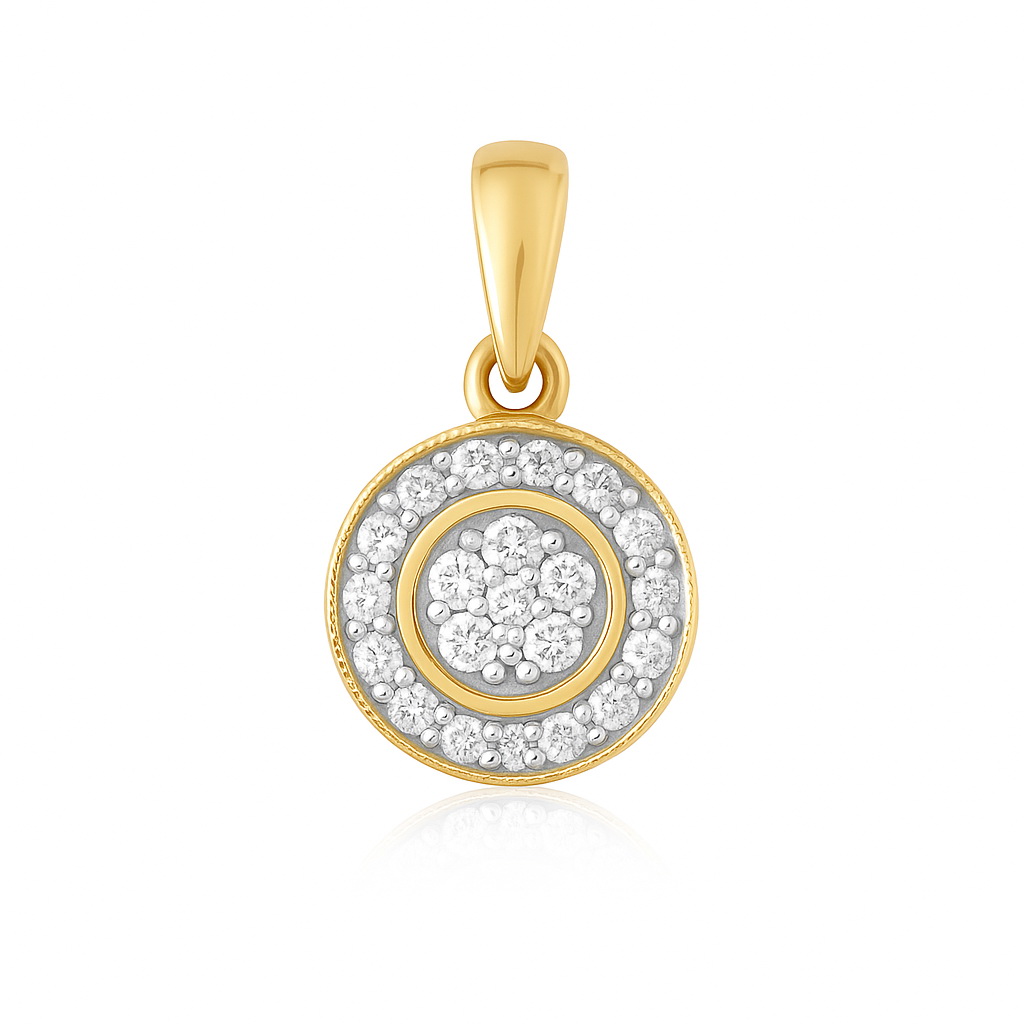 Olśniewający wisiorek z żółtego złota próby 0,585, zdobiony aż 26 diamentami o łącznej masie 0,18 ct. Subtelne brylanty w oprawie o średnicy ok. 10 mm tworzą elegancki, okrągły motyw, który przyciąga wzrok blaskiem i wyrafinowaniem. Idealny wybór dla kobiet ceniących luksus i klasyczną elegancję. Ten wisiorek będzie znakomitym prezentem na wyjątkową okazję, podkreślając indywidualny styl każdej kobiety.