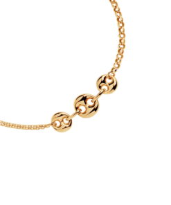Elegancka bransoleta wykonana z żółtego złota próby 333. Jej wyjątkowy charakter podkreślają ozdobne elementy w formie połyskujących, okrągłych ogniw, które pięknie komponują się z delikatnym łańcuszkiem. Regulowana długość pozwala na idealne dopasowanie do nadgarstka, czyniąc z niej uniwersalny dodatek do każdej stylizacji.