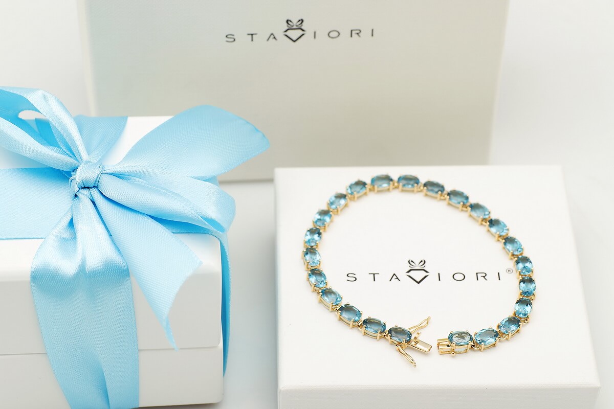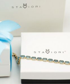 Okouzlující náramek ze 14karátového žlutého zlata zdobený 23 nádhernými topazy London Blue. Hluboký odstín modré skvěle ladí s teplým tónem zlata a vytváří šperk plný elegance a noblesy. Ideální volba pro slavnostní příležitosti i jako luxusní doplněk každodenního stylu.