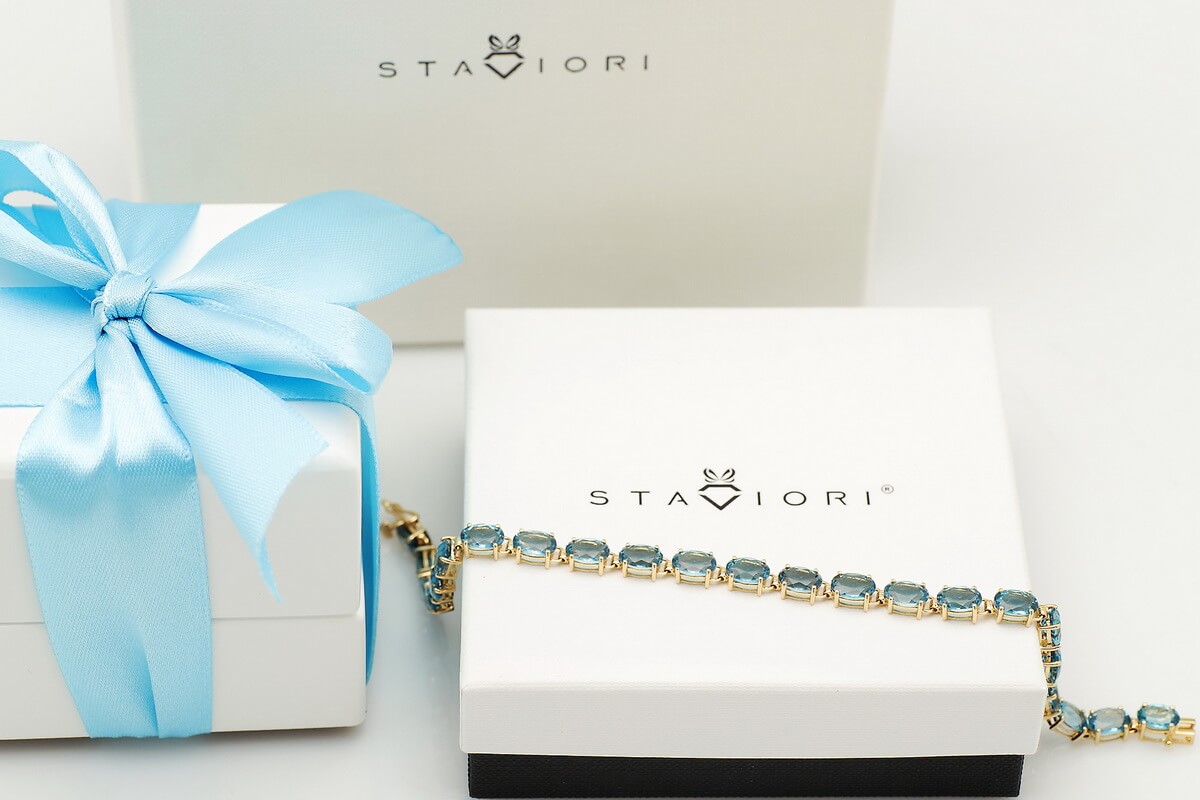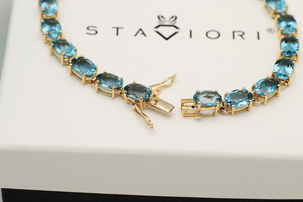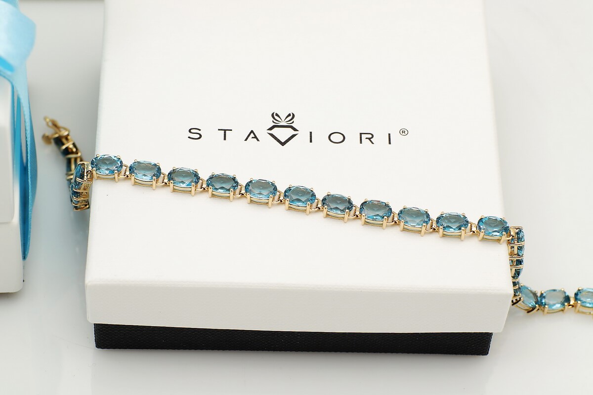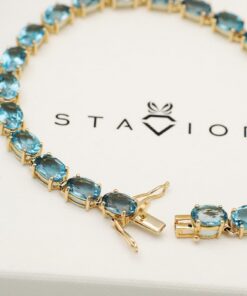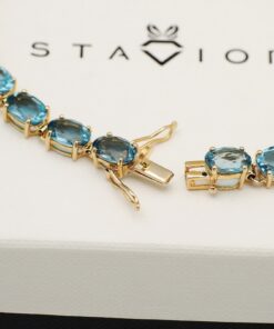 Zachwycająca bransoleta wykonana z 14-karatowego żółtego złota, ozdobiona aż 23 błękitnymi topazami London Blue. Kamienie o głębokiej, hipnotyzującej barwie doskonale kontrastują ze szlachetnym złotem, tworząc kompozycję pełną elegancji i luksusu. Bransoleta zachwyca swoją klasą – to biżuteria, która doda szyku każdej stylizacji i będzie idealnym wyborem na wyjątkowe okazje.