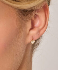 Roztomilé náušnice ve tvaru srdce ze žlutého zlata o ryzosti 0,333 jsou ideální pro romantické duše a milovnice jemných šperků. Třpytivé zirkony osazené na povrchu srdíček dodávají šperku eleganci a lesk. Skvěle doplní každodenní vzhled i poslouží jako krásný dárek z lásky. Klasické zapínání zajišťuje pohodlné nošení.