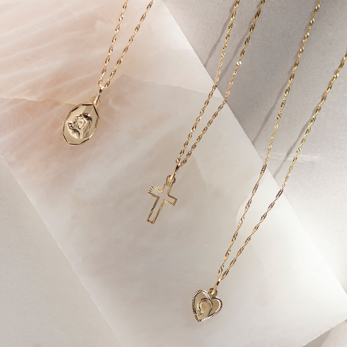 Subtelny medalik z wizerunkiem Matki Boskiej, wykonany z żółtego złota próby 0,333. Owalna forma i precyzyjne wykończenie sprawiają, że jest to wyjątkowy symbol wiary i elegancji. Delikatna oprawa nadaje całości klasyczny i ponadczasowy charakter, doskonały zarówno na prezent, jak i do codziennego noszenia.