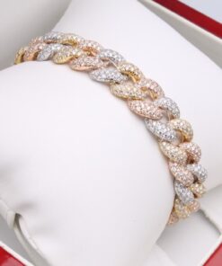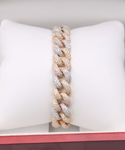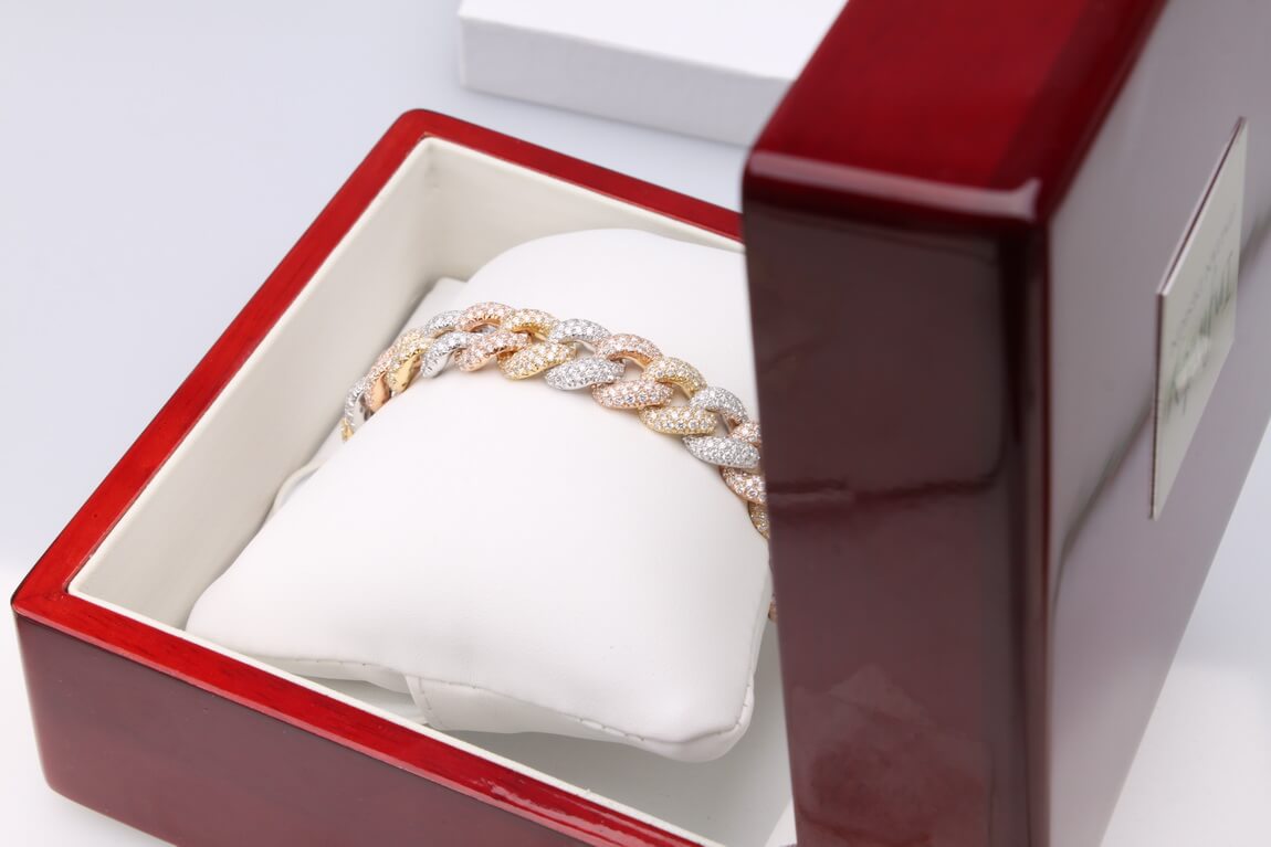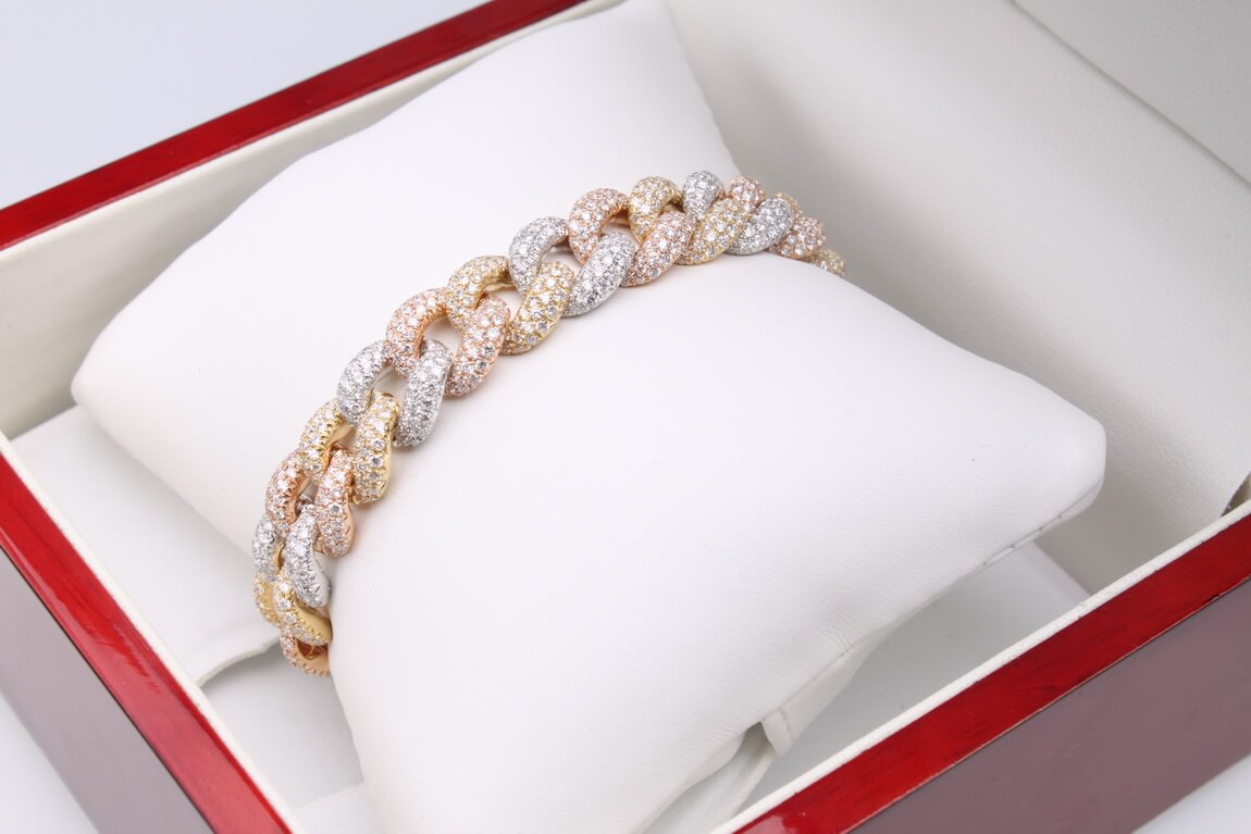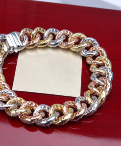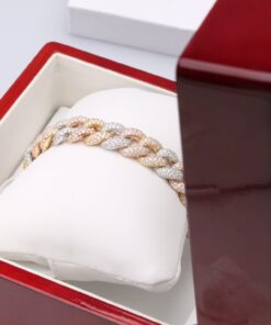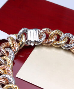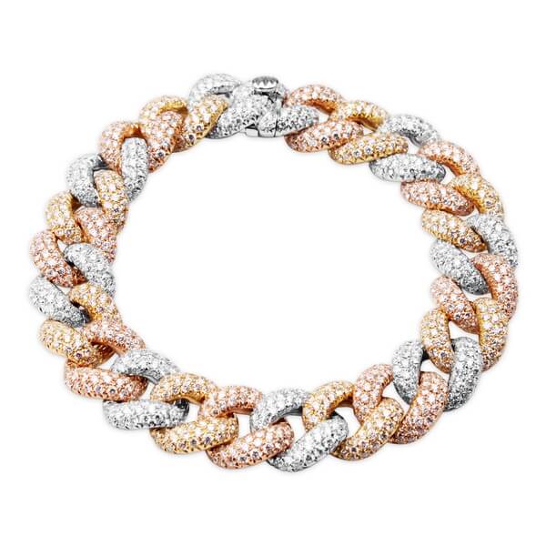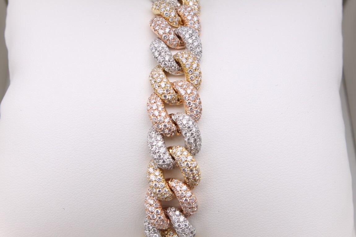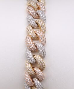 Imponująca bransoleta o długości 18 cm, wykonana z 18-karatowego złota w trzech odcieniach – żółtym, białym i różowym (750). Każde ogniwo w klasycznym splocie kubańskim jest misternie wysadzane 1340 brylantami o łącznej masie około 11,55ct (barwa G, czystość SI1), co nadaje całości hipnotyzujący, wielowymiarowy blask. Kombinacja ciepłych i chłodnych tonów złota podkreśla unikatowy charakter projektu, idealny dla osób ceniących wyrafinowany luksus.