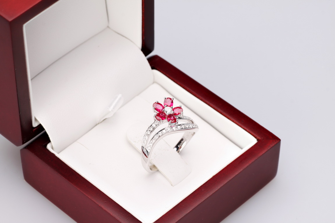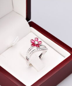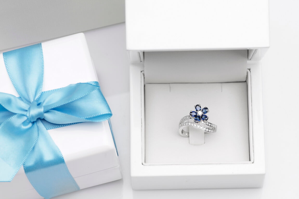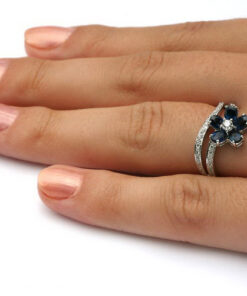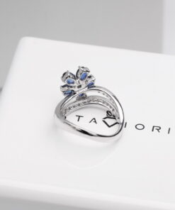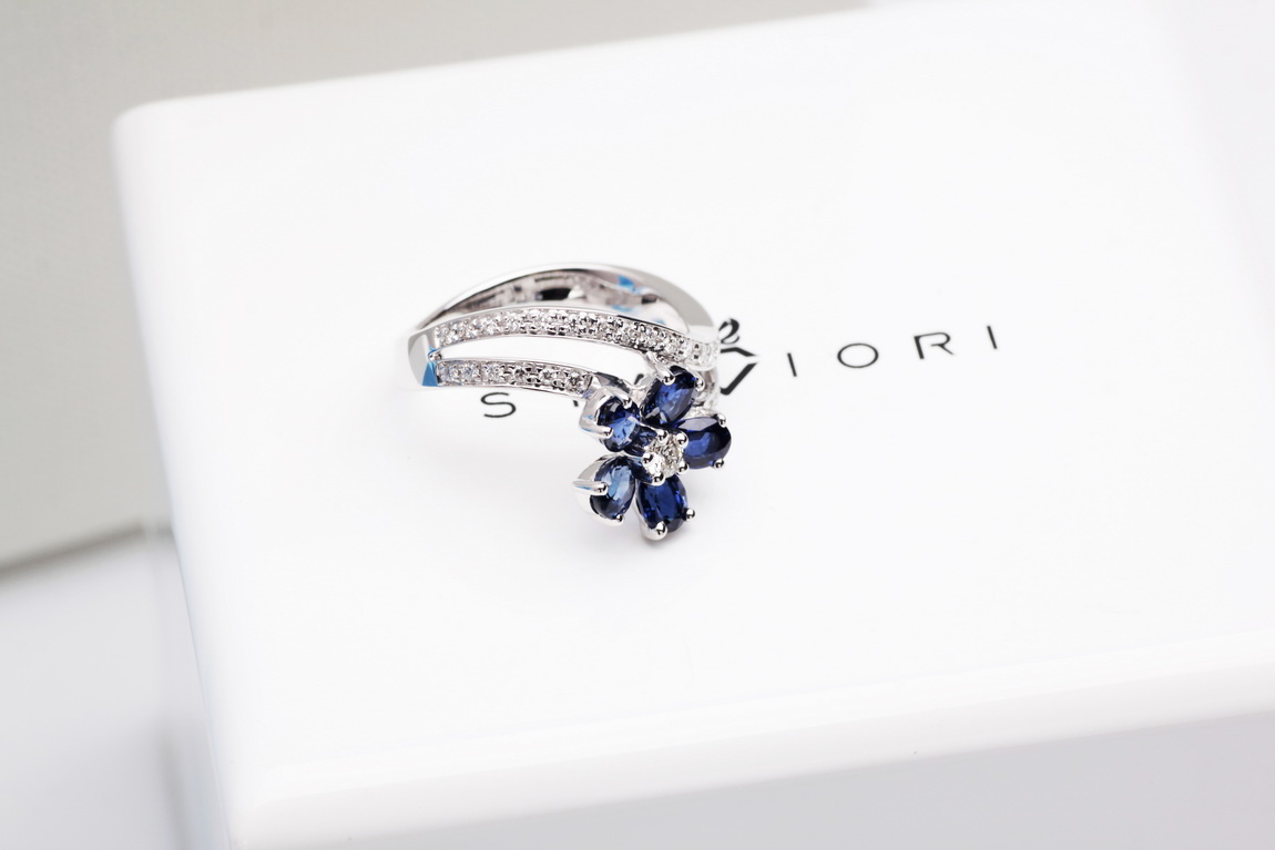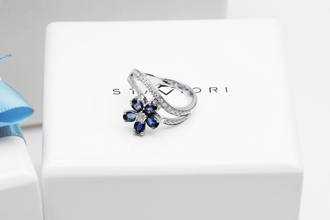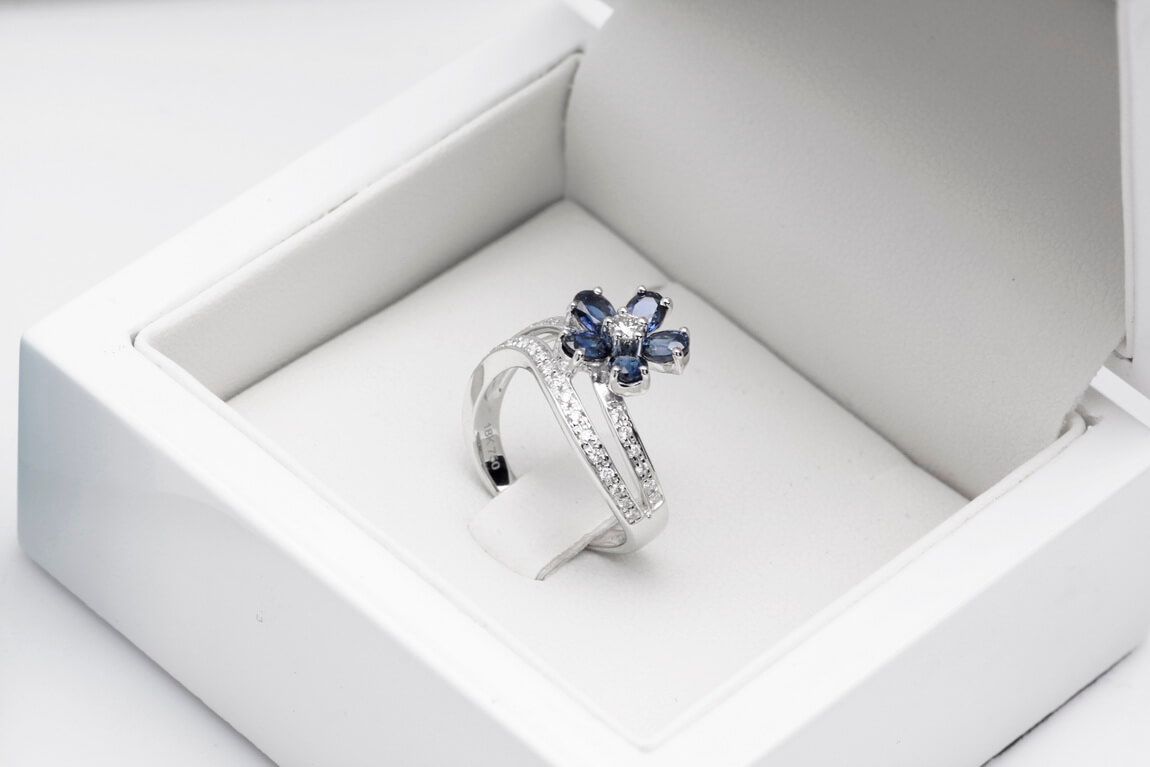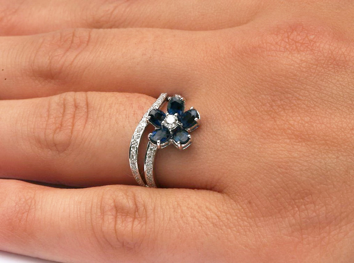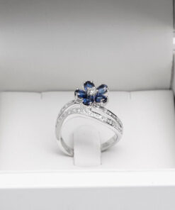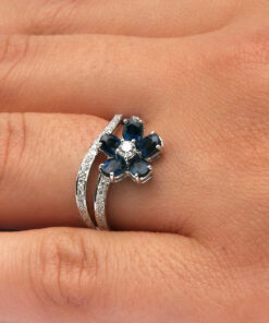 Zachwycający pierścionek zaręczynowy wykonany z białego złota próby 750, który olśniewa swoją wyjątkową kompozycją kamieni. Centrum pierścionka zdobi kwiatowy motyw utworzony z pięciu intensywnie niebieskich szafirów o łącznej masie 1,45 ct oraz brylantowego diamentu osadzonego pośrodku. Dodatkowo, obrączka zdobiona jest 30 drobnymi brylantami, które subtelnie podkreślają luksusowy charakter biżuterii. To propozycja dla kobiet ceniących elegancję z nutą oryginalności.