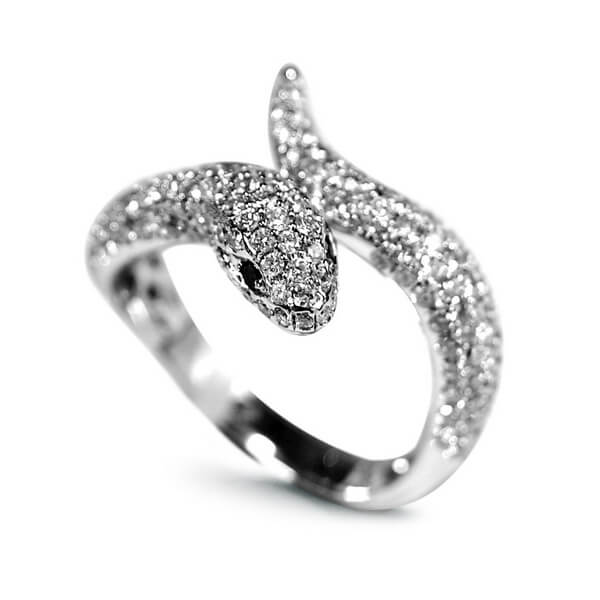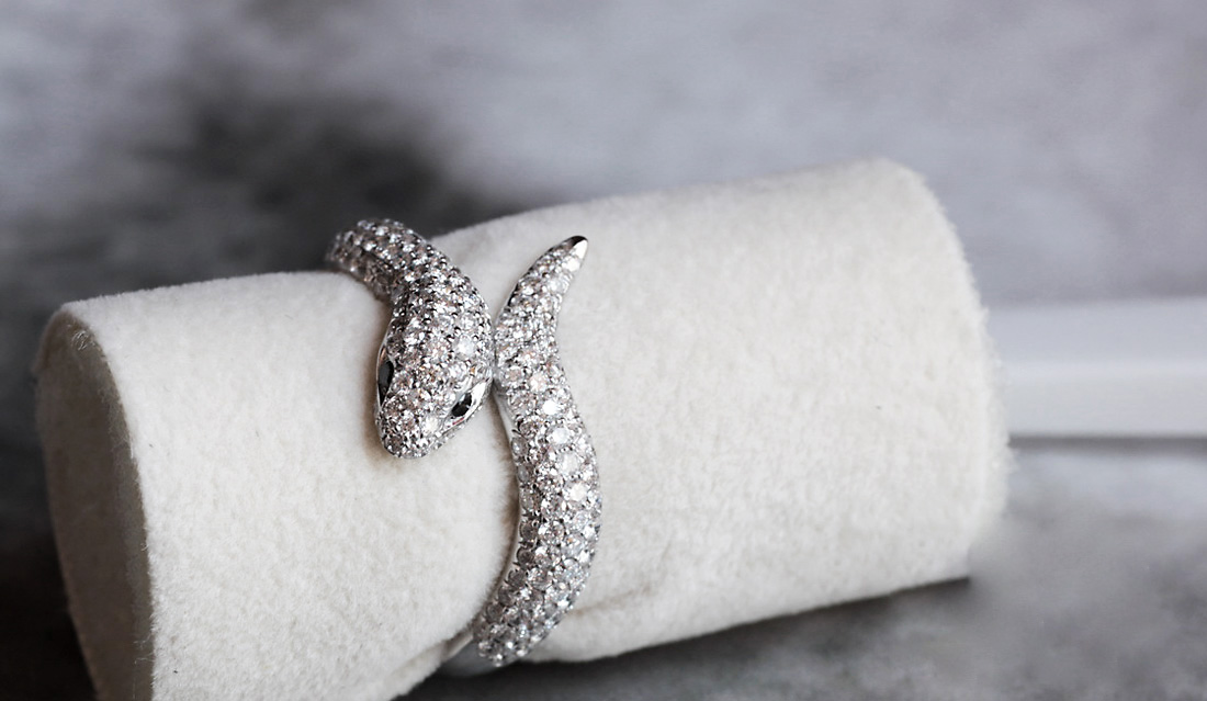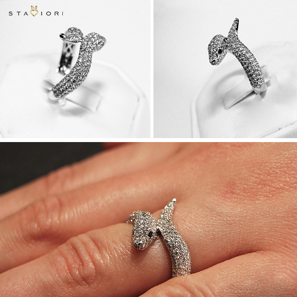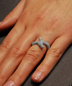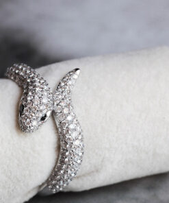 Zjawiskowy pierścionek w kształcie węża wykonany z ekskluzywnego 18-karatowego białego złota. Całość zdobi aż 181 białych brylantów o łącznej masie 1,38 ct, które nadają mu niepowtarzalnego blasku i luksusowego charakteru. Dodatkowo w oczach węża osadzono dwa czarne diamenty, podkreślające jego tajemniczy, hipnotyzujący wygląd. Ten spektakularny projekt zachwyca nie tylko formą, ale i niezwykłą precyzją wykonania. Idealna propozycja dla kobiet, które szukają biżuterii o silnym wyrazie i artystycznym zacięciu.