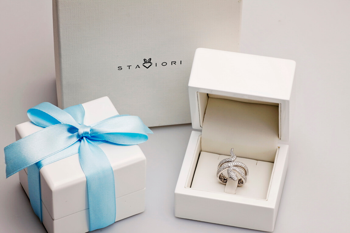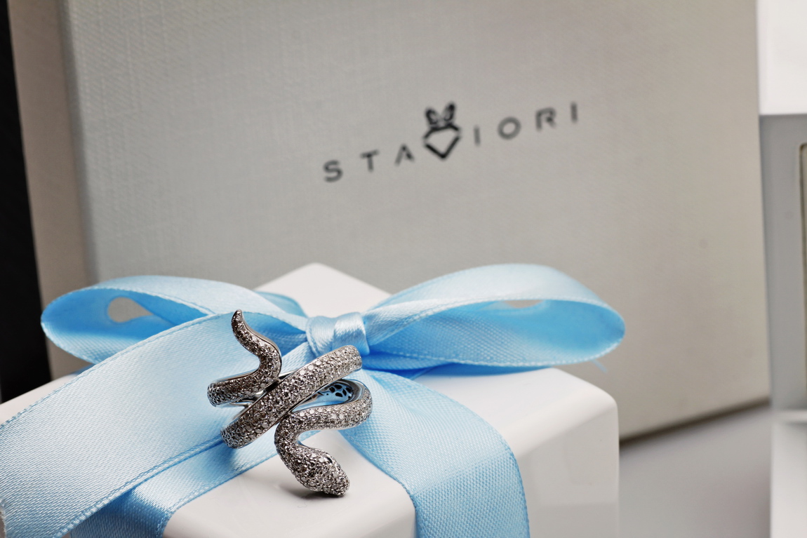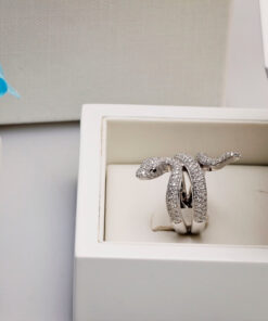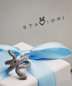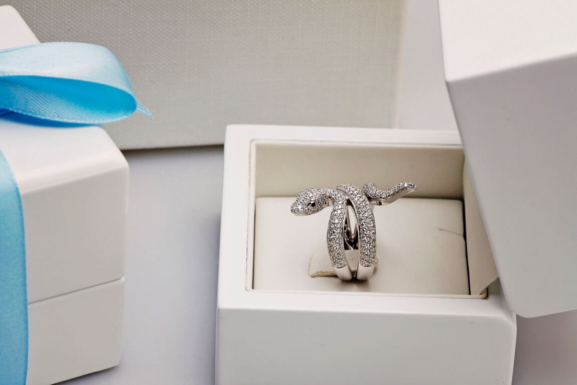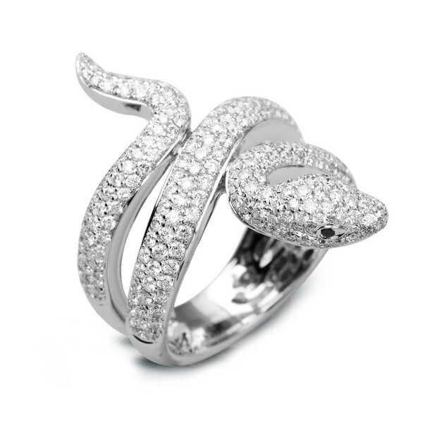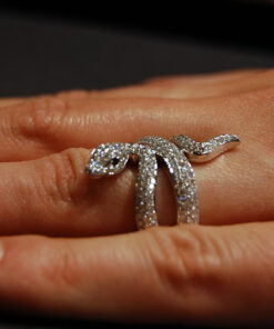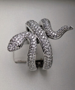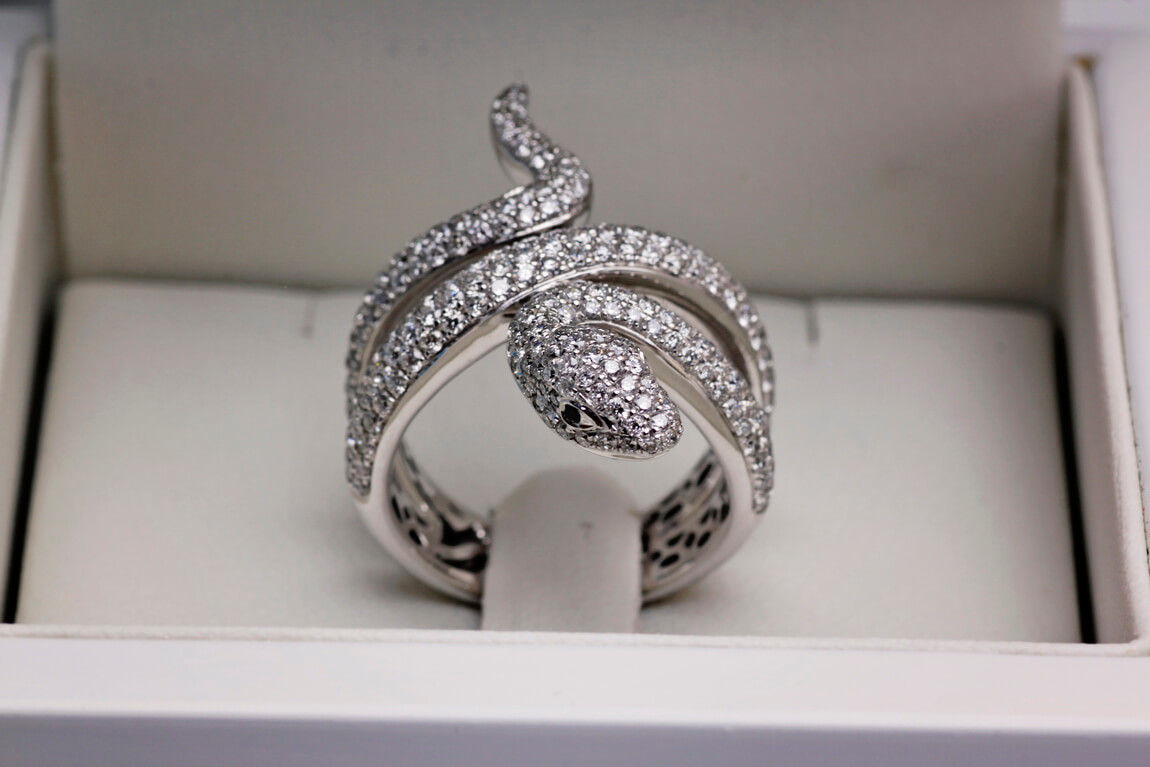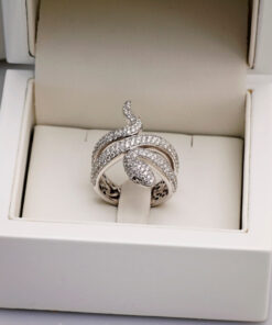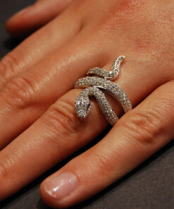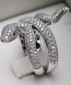 Zjawiskowy pierścionek w formie wijącego się węża, wykonany z 18-karatowego białego złota. Jego powierzchnię zdobi aż 243 lśniące brylanty o łącznej masie 1,67 ct, które pięknie podkreślają unikalny kształt biżuterii. Głowę węża akcentują dwa czarne diamenty, nadając całości wyrazistego charakteru i tajemniczej elegancji. To wyjątkowy pierścionek, który zachwyci miłośników odważnych, luksusowych dodatków.