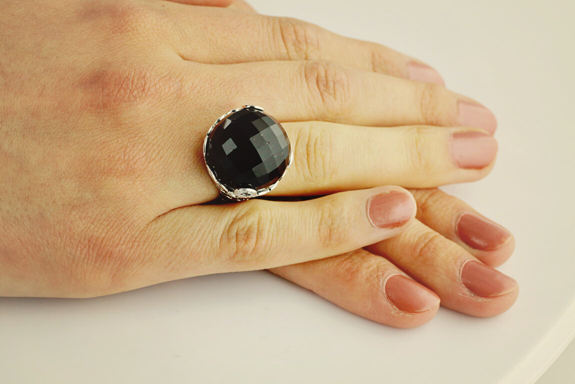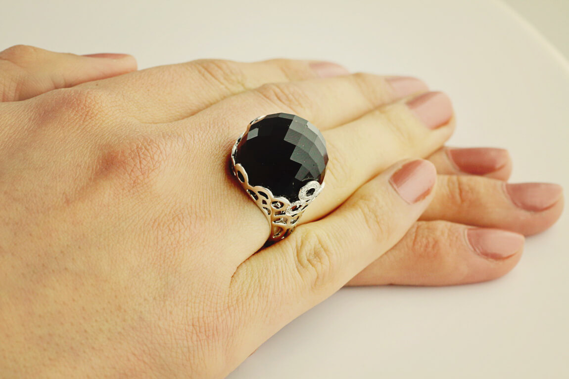 Imponujący pierścionek z białego złota próby 0,750, który zachwyca od pierwszego spojrzenia. Centralnym punktem kompozycji jest masywny onyks o wadze ponad 45 ct, osadzony w ażurowej koronie o nowoczesnym, geometrycznym kształcie. Całość dopełnia 70 drobnych brylantów, które dodają blasku i elegancji. Ten artystyczny model łączy w sobie ekstrawagancję, wyrafinowany styl i wyjątkowy charakter – idealny dla kobiet, które kochają biżuterię z osobowością.