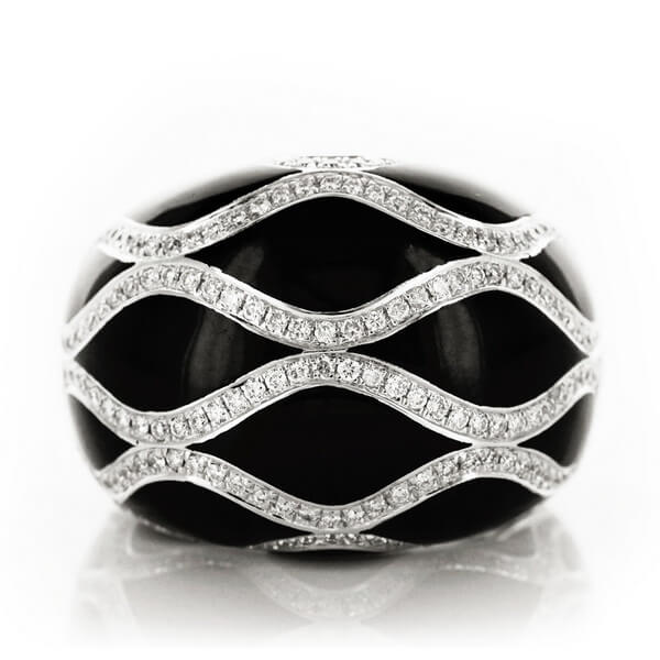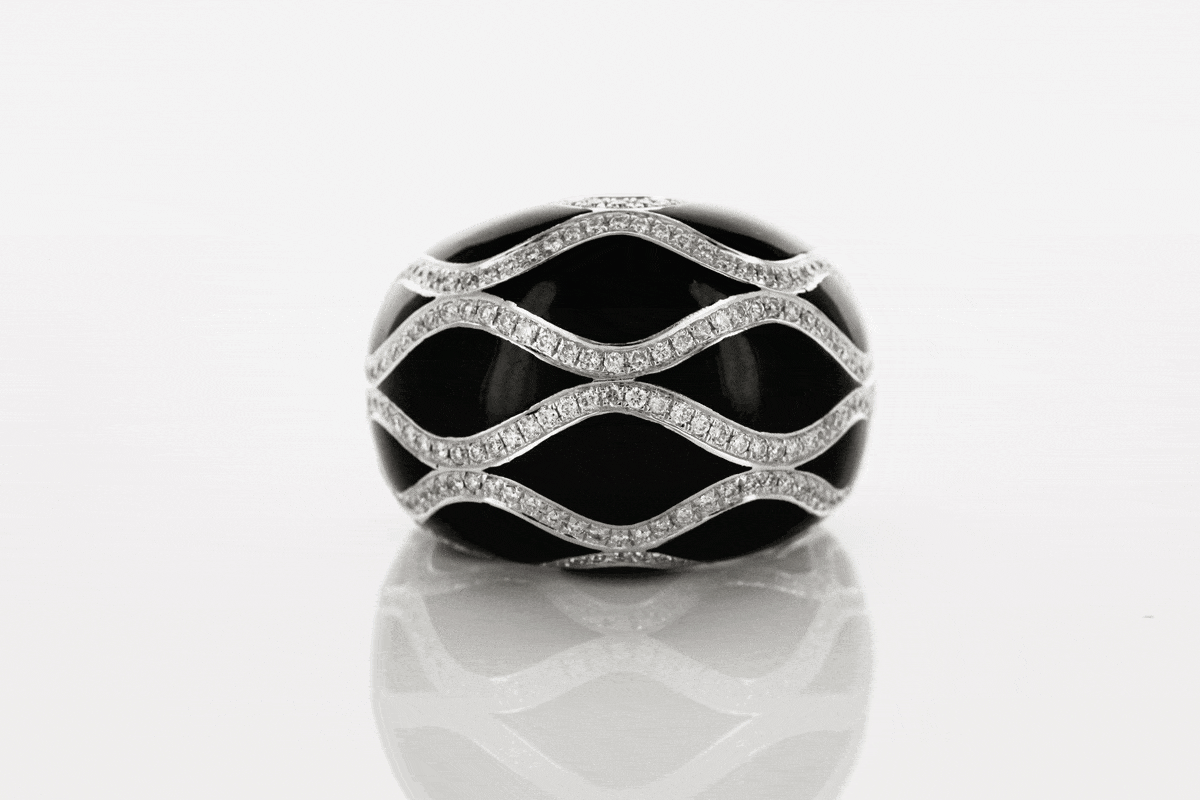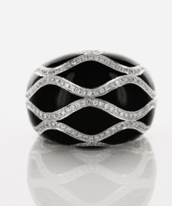 Zjawiskowy pierścionek z białego złota, który przyciąga wzrok kontrastem głębokiej czerni i iskrzących się diamentów. Eleganckie fale z 272 drobnymi brylantami otulają całą koronę, tworząc wyjątkowy i nowoczesny efekt. Ręcznie nakładana czarna laka dodaje mu niepowtarzalnego charakteru, a wypukła forma sprawia, że ten model wygląda niezwykle spektakularnie na dłoni. To biżuteria dla kobiet ceniących luksus i oryginalny design.
