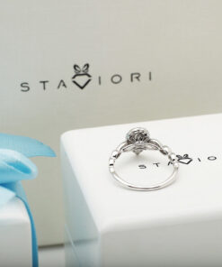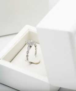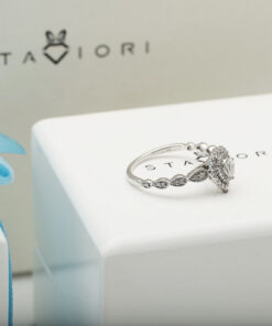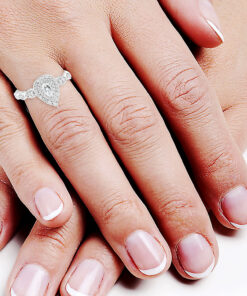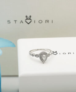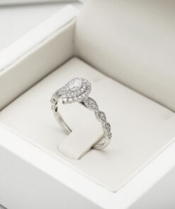 Zjawiskowy pierścionek z białego złota próby 0,585, którego serce stanowi diament w szlifie gruszkowym o masie 0,23 ct. Otoczony aż 47 brylantami o łącznej masie 0,40 ct, tworzy niezwykle efektowną i lśniącą kompozycję. Trzy rzędy diamentów w kształcie łezki dodają mu królewskiego uroku i wyjątkowego blasku. Ten luksusowy model zachwyci każdą kobietę i będzie idealnym wyborem na zaręczyny lub niezapomniany prezent.