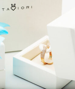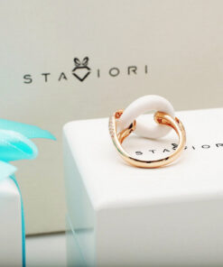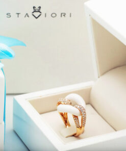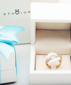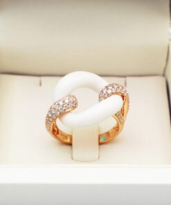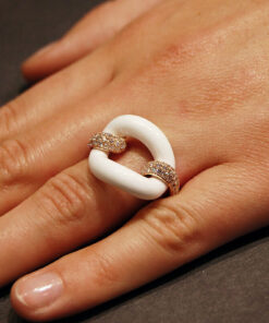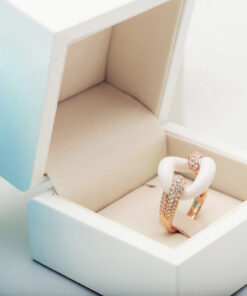 Zachwycający pierścionek z 18-karatowego różowego złota, który emanuje nowoczesną elegancją i luksusem. Centralnym elementem kompozycji jest gładki, biały agat o finezyjnym kształcie ogniwa, który symbolizuje trwałość i siłę. Dwa ramiona obrączki, wysadzane aż 108 brylantami o łącznej masie 1,05 ct, dodają olśniewającego blasku i podkreślają prestiżowy charakter biżuterii. To wyjątkowy model dla kobiet, które cenią odważny design i najwyższą jakość.