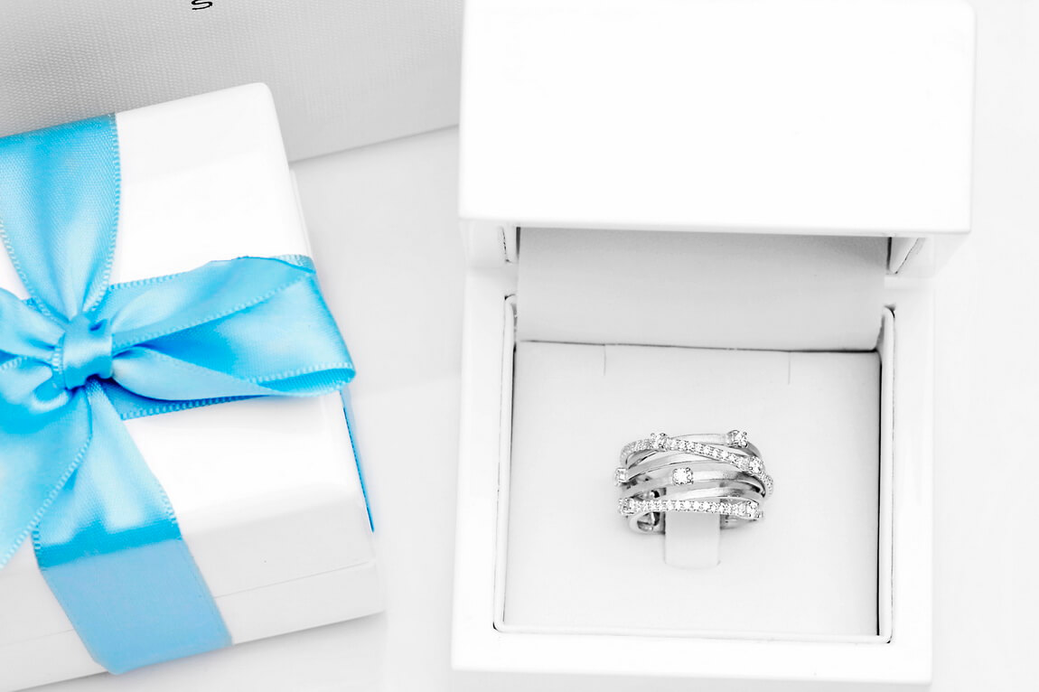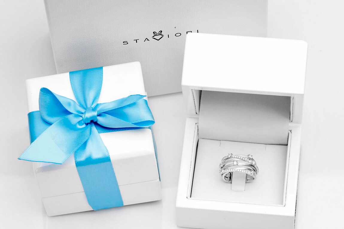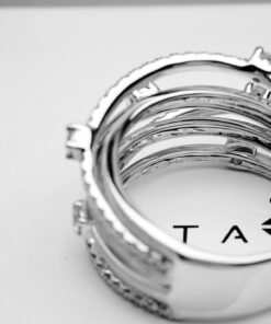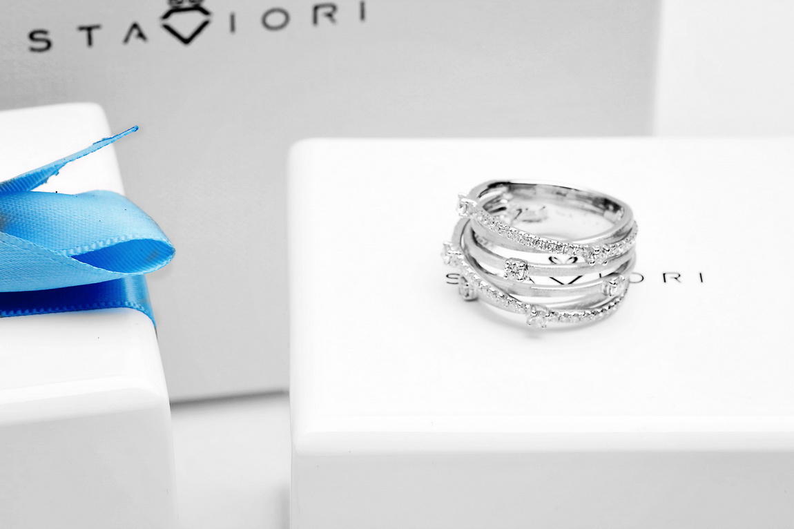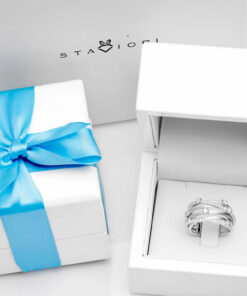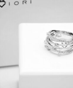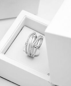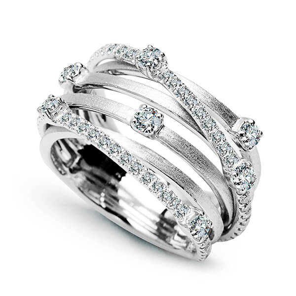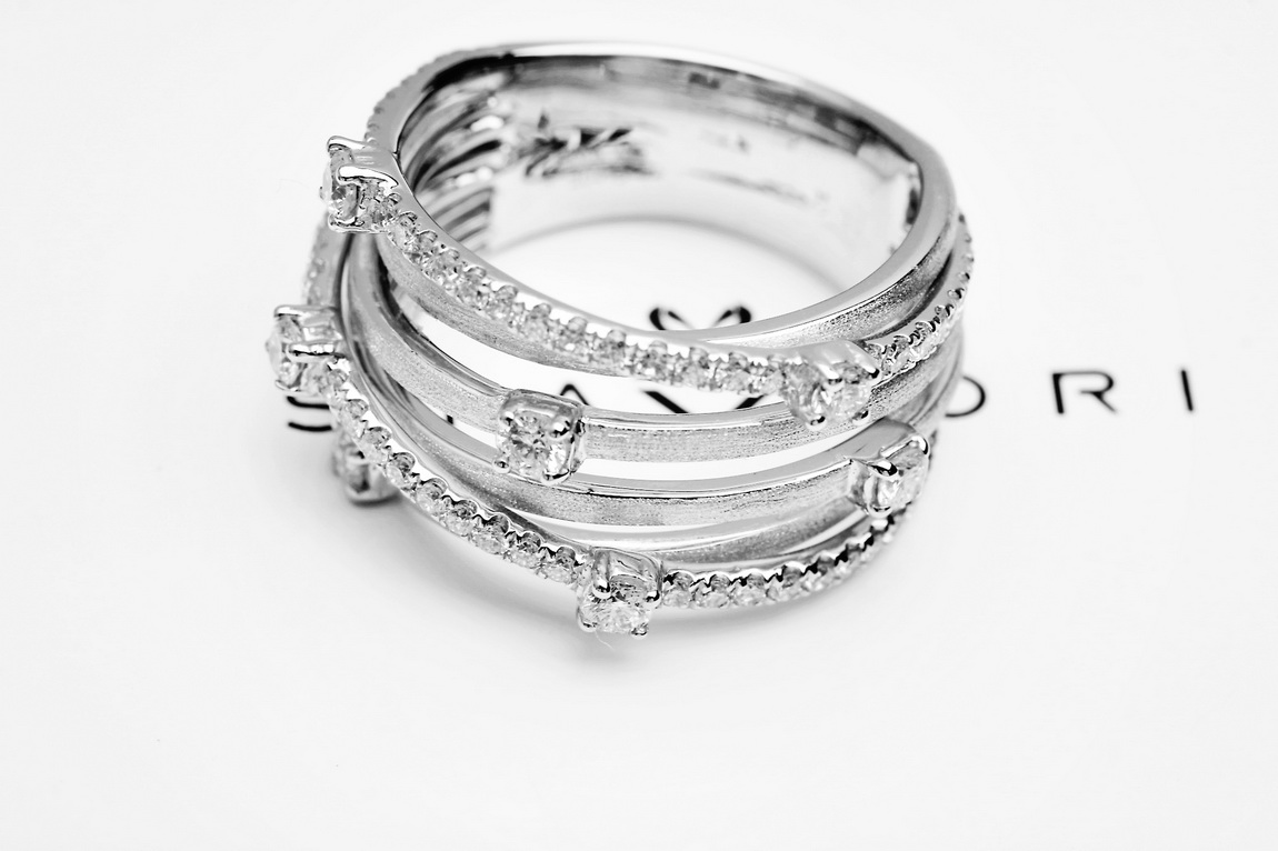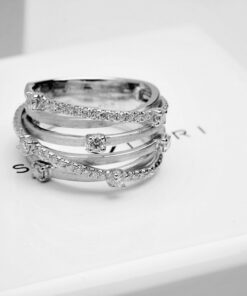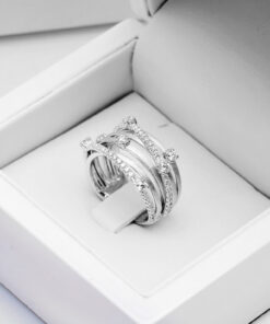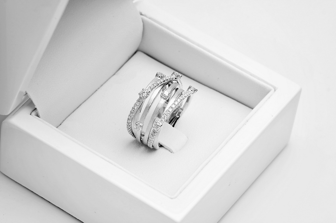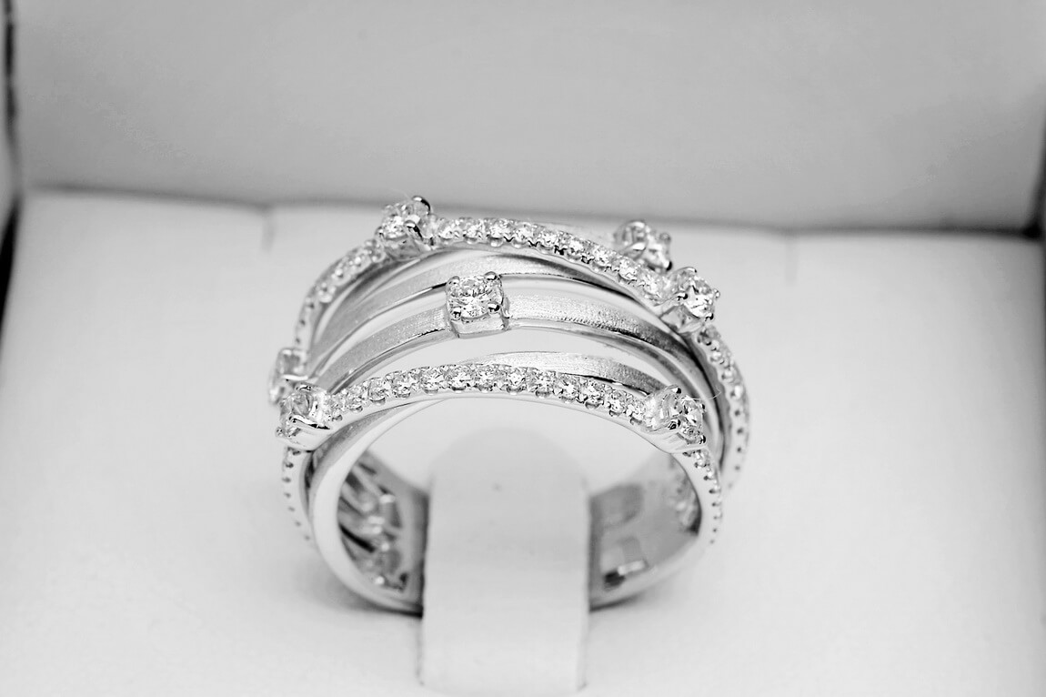 Olśniewający pierścionek wykonany z białego złota próby 0,750, zachwyca nowoczesną formą i luksusowym wykończeniem. Aż 73 diamenty o łącznej masie 0,94ct tworzą spektakularny blask, oplatając harmonijnie każdy z pasów obrączki. Dynamiczne linie, efekt kontrastu złota i subtelny połysk kamieni czynią z tego modelu prawdziwe dzieło sztuki jubilerskiej. Idealny wybór dla kobiety kochającej wyrazistą elegancję i wyjątkowy design.