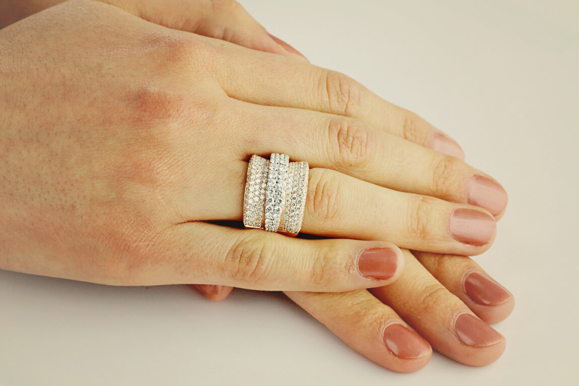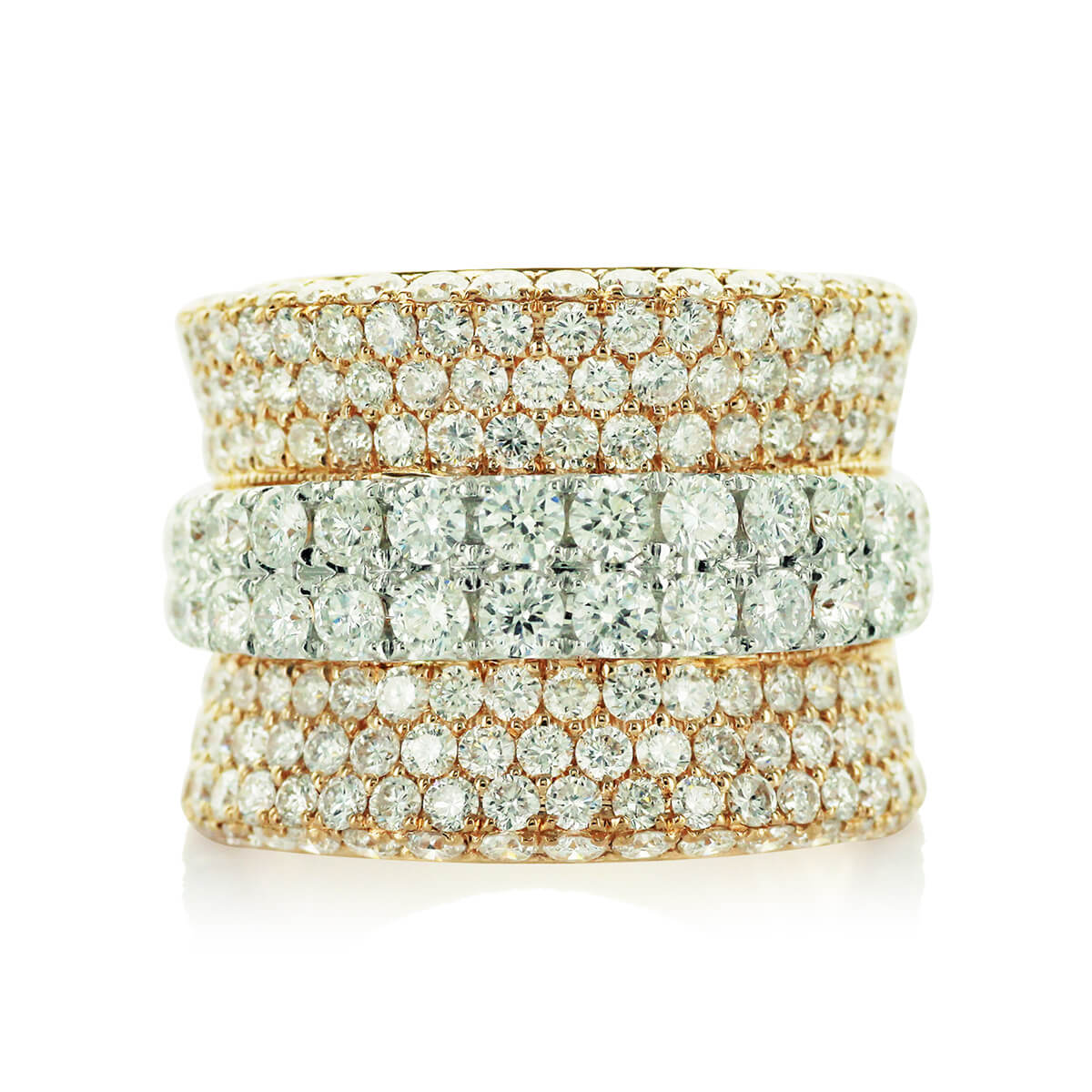 Spektakularny pierścionek z żółtego i białego złota próby 0.750, który zachwyca swoim bogactwem i kunsztem wykonania. Pokryty aż 190 diamentami o łącznej masie 4,26 ct, tworzy olśniewającą mozaikę blasku i elegancji. Imponująca forma i wielopoziomowe ułożenie kamieni nadają mu ekstrawaganckiego charakteru, idealnego dla kobiet kochających luksus i oryginalność. To prawdziwe dzieło sztuki jubilerskiej, które przyciąga spojrzenia i podkreśla prestiż.