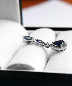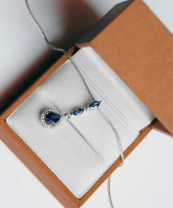 Zjawiskowy wisiorek wykonany z białego złota 14K, ozdobiony trzema głębokimi, szafirowymi kamieniami o łącznej masie 1,39 ct. Centralny szafir w kształcie łezki otoczony jest subtelnym halo z 21 błyszczących diamentów, które podkreślają jego intensywną barwę. Smukła forma i elegancka linia sprawiają, że jest to biżuteria idealna na wyjątkowe okazje, emanująca szykiem i ponadczasowym pięknem.