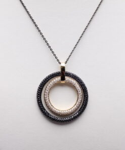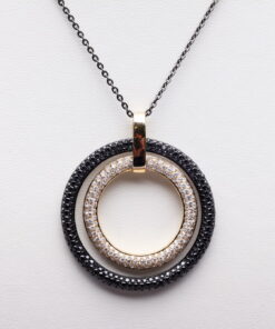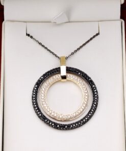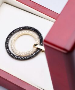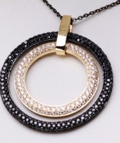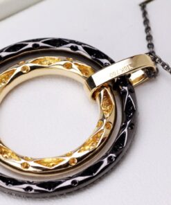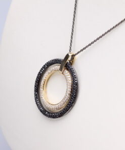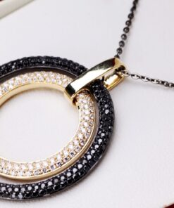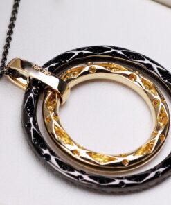 Wyjątkowy wisiorek z żółtego i czarnego złota próby 0,750, zachwycający swoim kontrastowym i luksusowym designem. Dwa splecione kręgi ozdobiono aż 360 diamentami o łącznej masie 2,64 ct – białymi i czarnymi, które tworzą efekt spektakularnego blasku i głębi. To biżuteria o niezwykłej elegancji, idealna dla kobiet ceniących niepowtarzalny styl i perfekcyjne wykonanie.