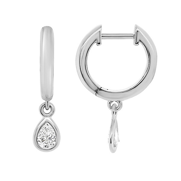 Delikatne kolczyki z białego złota o klasycznym kształcie kół z zawieszką w formie łezki. Subtelnie osadzone diamenty o szlifie gruszki pięknie odbijają światło, dodając blasku każdej stylizacji. Elegancja i nowoczesność spotykają się tu w wyjątkowej harmonii, tworząc biżuterię idealną na co dzień i na specjalne okazje.