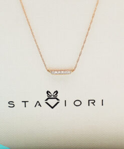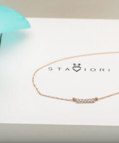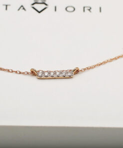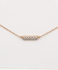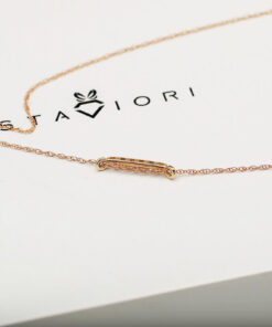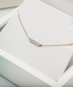 Zachwycający naszyjnik z różowego złota ozdobiony sześcioma lśniącymi diamentami o brylantowym szlifie. Minimalistyczny, subtelny wzór o prostokątnym kształcie, który pięknie podkreśli dekolt i doda blasku każdej stylizacji. Delikatny łańcuszek z możliwością regulacji długości sprawia, że naszyjnik doskonale sprawdzi się zarówno solo, jak i w zestawie z inną biżuterią. Idealny wybór dla kobiet ceniących nowoczesną elegancję oraz ponadczasowy styl.