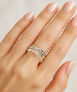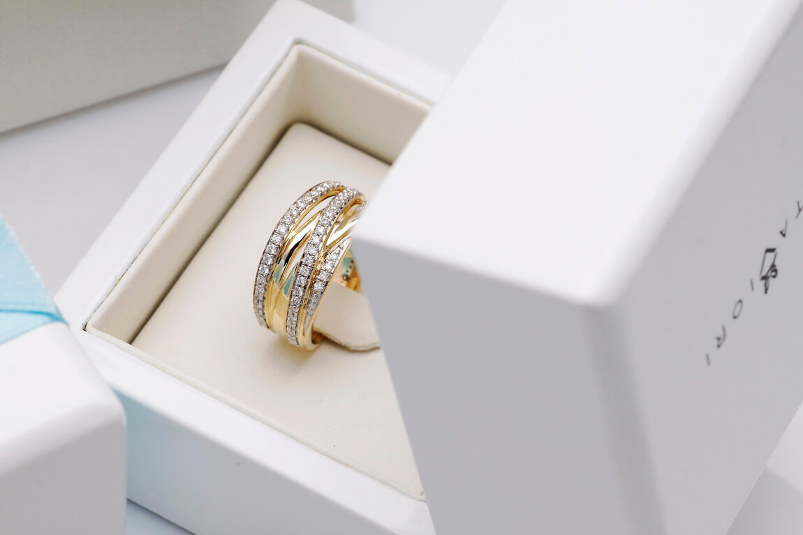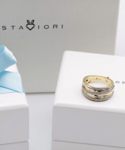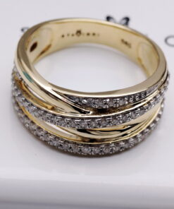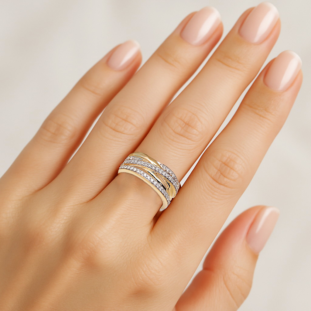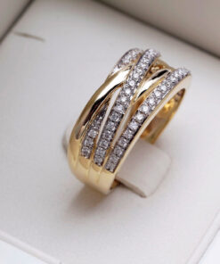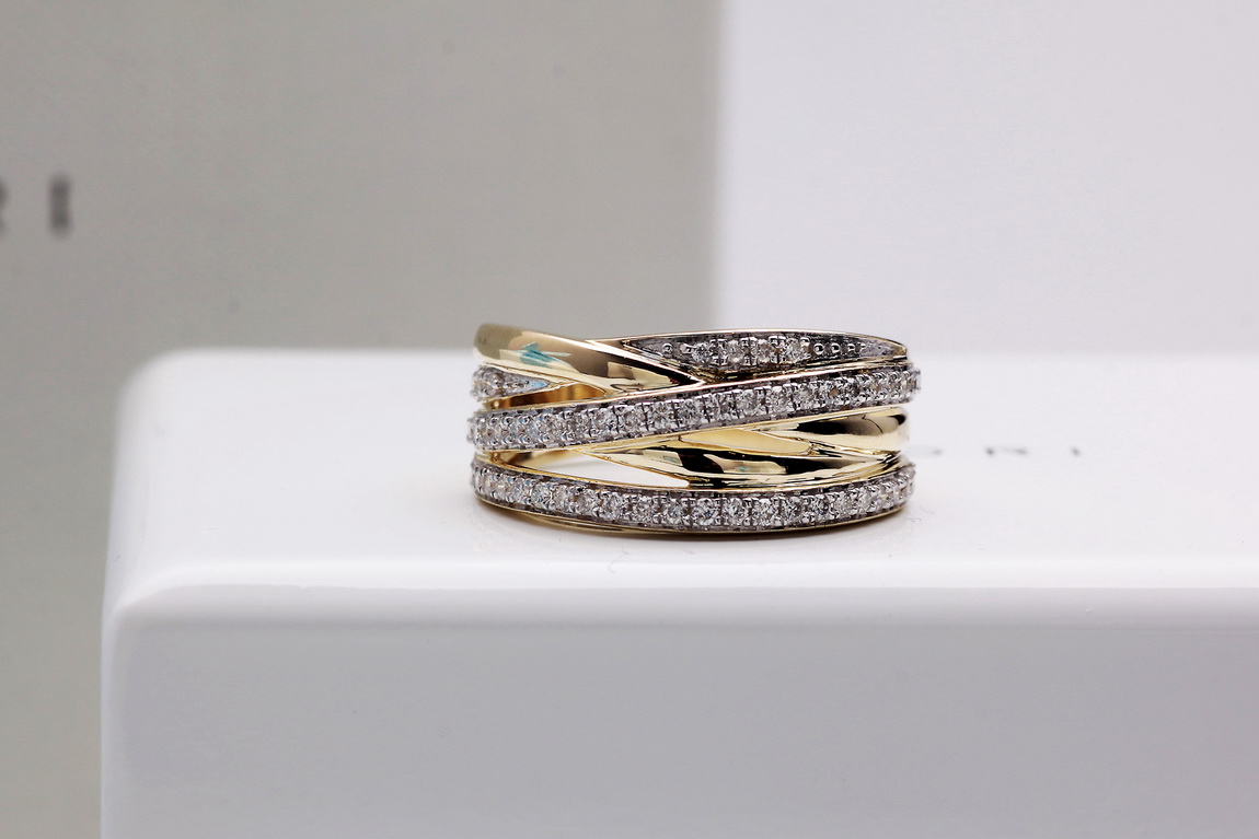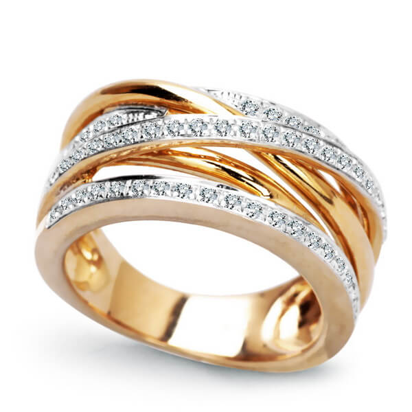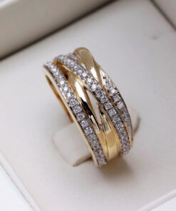 Spektakularny pierścionek wykonany z połączenia żółtego i białego złota próby 0,585. Jego wyjątkowa forma oparta na szerokiej obrączce z misternie przeplatającymi się pasmami sprawia, że przyciąga wzrok i emanuje luksusem. Aż 52 brylanty o łącznej masie 0,48 ct dodają mu niepowtarzalnego blasku i prestiżu. To idealna biżuteria dla kobiet kochających wyraziste, a zarazem eleganckie dodatki. Olśniewający wybór na wyjątkowe okazje.