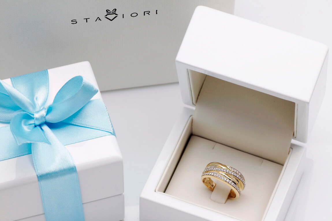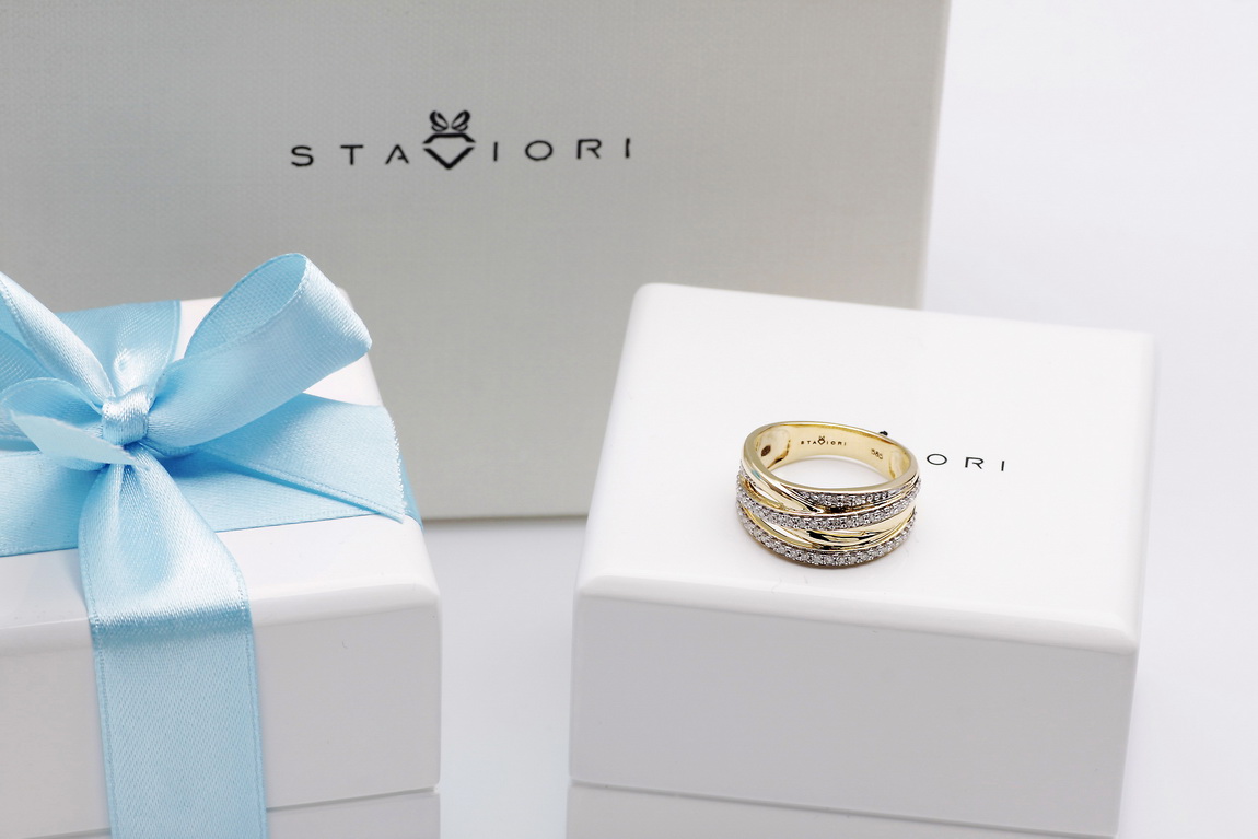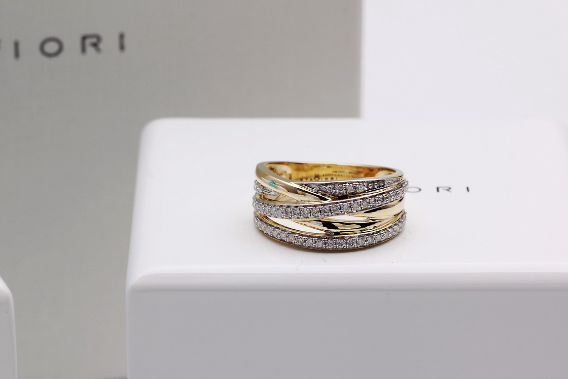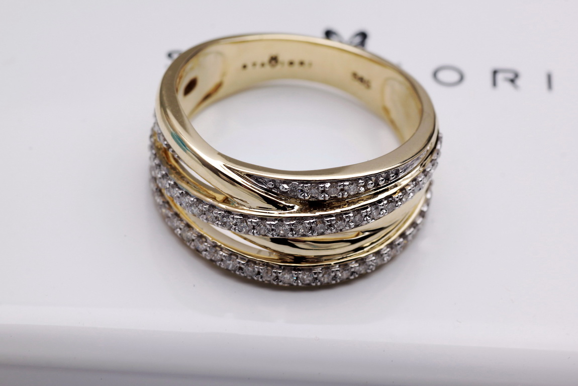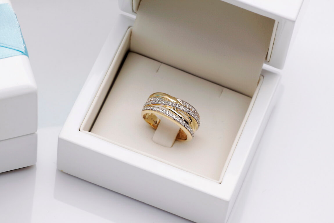 Spektakularny pierścionek wykonany z połączenia żółtego i białego złota próby 0,585. Jego wyjątkowa forma oparta na szerokiej obrączce z misternie przeplatającymi się pasmami sprawia, że przyciąga wzrok i emanuje luksusem. Aż 52 brylanty o łącznej masie 0,48 ct dodają mu niepowtarzalnego blasku i prestiżu. To idealna biżuteria dla kobiet kochających wyraziste, a zarazem eleganckie dodatki. Olśniewający wybór na wyjątkowe okazje.