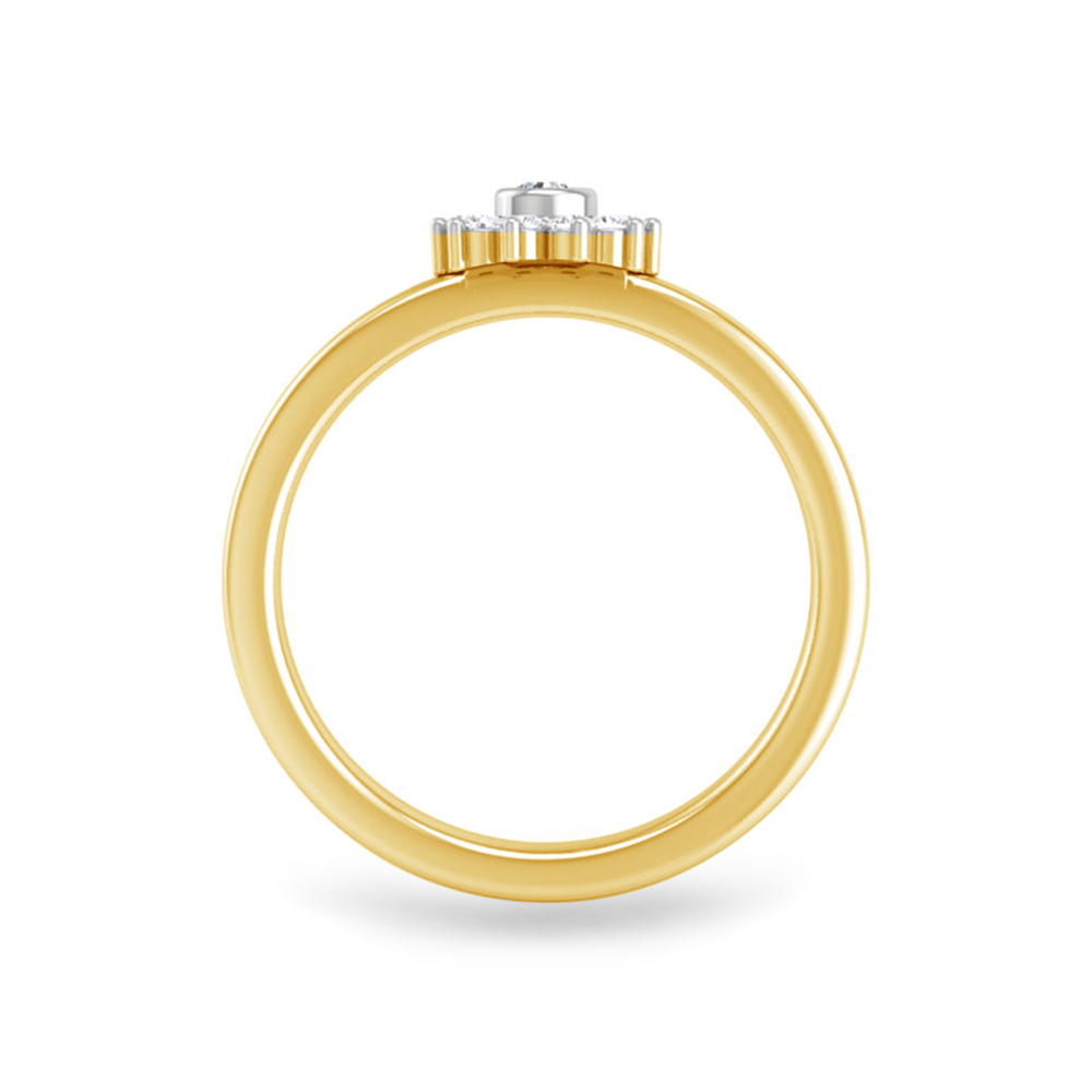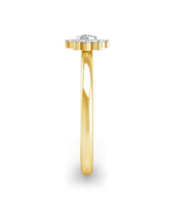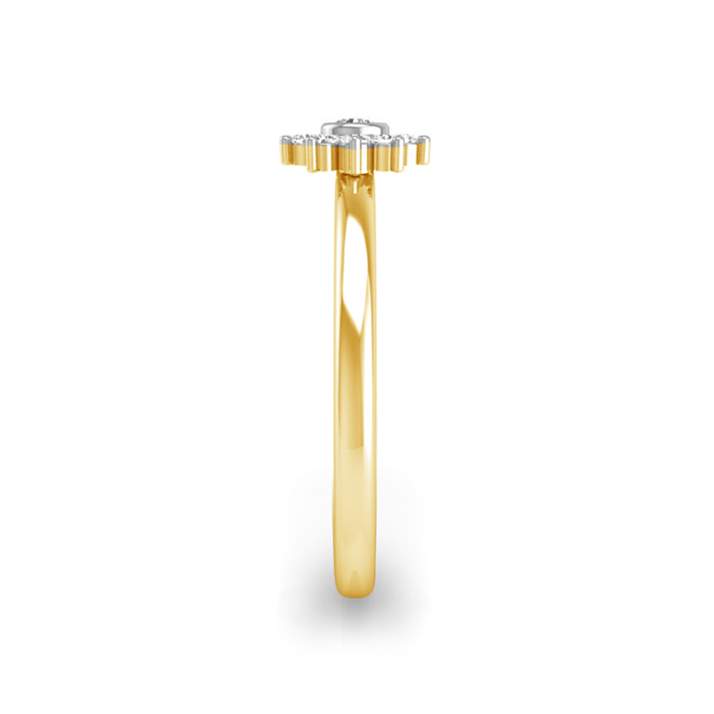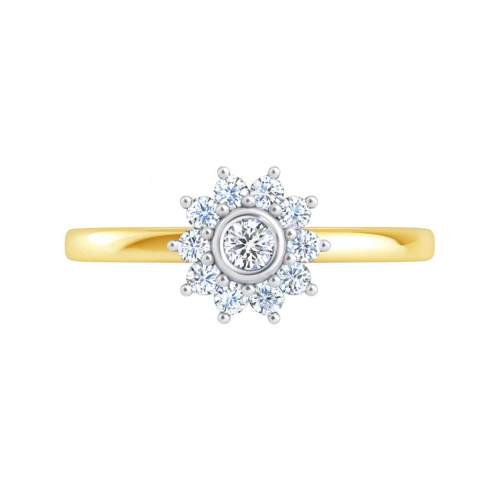 Urokliwy pierścionek zaręczynowy wykonany z żółtego złota próby 585, ozdobiony dwunastoma diamentami o łącznej masie 0,16 ct. Centralny kamień otoczony jest subtelnym diamentowym wieńcem, tworząc motyw rozkwitającego kwiatu. Delikatna obrączka w klasycznej formie nadaje biżuterii ponadczasowego charakteru. To elegancki i romantyczny pierścionek, który będzie pięknym symbolem miłości.