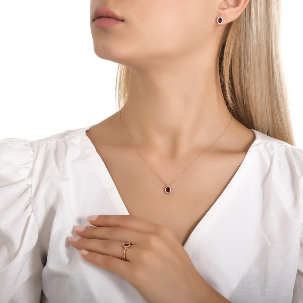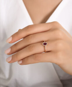 Zjawiskowy pierścionek zaręczynowy wykonany z żółtego złota próby 750, którego centralnym punktem jest piękny rubin o masie 0,41 ct. Kamień otacza subtelna aureola 36 lśniących diamentów o szlifie brylantowym, które dodają całości wyjątkowego blasku i elegancji. Smukła, złota obrączka z delikatnym diamentowym akcentem na bokach podkreśla wyrafinowany charakter biżuterii. To pierścionek pełen klasy i romantyzmu, idealny jako symbol miłości i wyjątkowych chwil.
