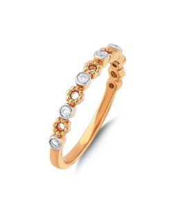 Delikatny pierścionek wykonany z żółtego złota próby 0,750, ozdobiony siedmioma diamentami o łącznej masie 0,09 ct. Subtelne oprawy w formie małych rozet i gładkich kółeczek nadają mu romantycznego i niepowtarzalnego charakteru. To idealny wybór dla kobiet ceniących lekkość, finezję i nowoczesną elegancję. Dostępny również w innych kolorach złota, by jeszcze lepiej dopasować go do indywidualnych preferencji.