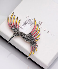 Oryginalna broszka w kształcie ptaka, wykonana z rodowanego srebra próby 0,925. Skrzydła ozdobione zostały barwną emalią w odcieniach czerwieni i żółci, tworząc niezwykle efektowną kompozycję. Subtelne markazyty nadają całości eleganckiego, retro charakteru i pięknie podkreślają detale. To wyjątkowy dodatek, który doda szyku zarówno klasycznym, jak i nowoczesnym stylizacjom.