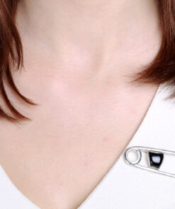 Stilvolle Brosche in Form einer eleganten Sicherheitsnadel aus rhodiniertem Sterlingsilber, deren außergewöhnlicher Charakter durch glänzende Markasite und tiefschwarze Onyxe betont wird, die zusammen einen außergewöhnlichen Kontrast und eine zeitlose Dekoration bilden. Sie ist die perfekte Wahl für Frauen, die originelle Accessoires mit Retro-Touch schätzen, die mit ihrem subtilen Glitzern und einzigartigen Design die Blicke auf sich ziehen.