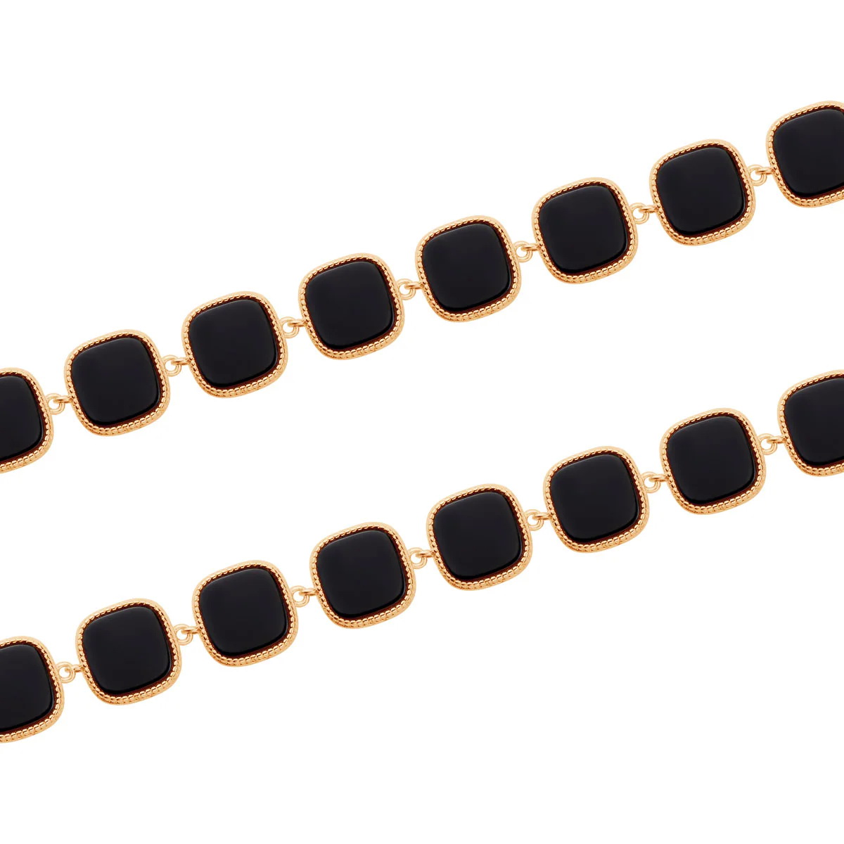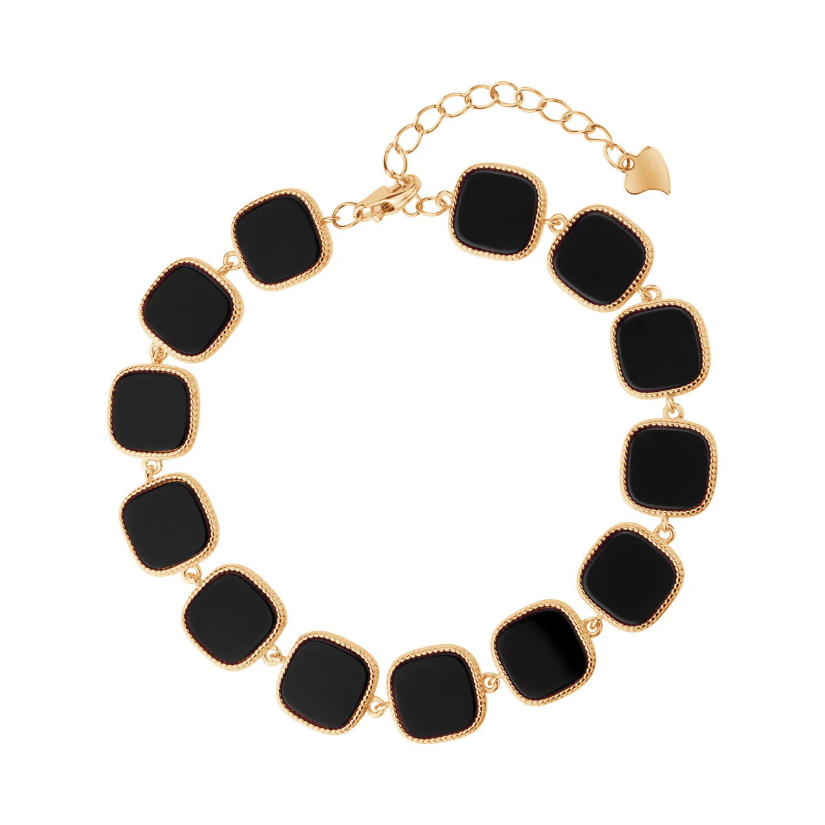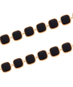 Zjawiskowa bransoletka wykonana z wysokiej próby pozłacanego srebra 925, która zachwyca odważnym, a zarazem niezwykle eleganckim designem. Głównym motywem biżuterii są geometryczne elementy w kształcie kwadratów, wypełnione głęboką czernią naturalnego onyksu, które pięknie kontrastują ze złocistą oprawą o subtelnym zdobieniu. Precyzyjne wykonanie oraz regulowane zapięcie zakończone uroczym serduszkiem sprawiają, że bransoletka idealnie układa się na nadgarstku. To biżuteria stworzona dla kobiet poszukujących wyrazistych dodatków, które dodadzą klasy zarówno wieczorowym kreacjom, jak i profesjonalnym zestawom biznesowym.