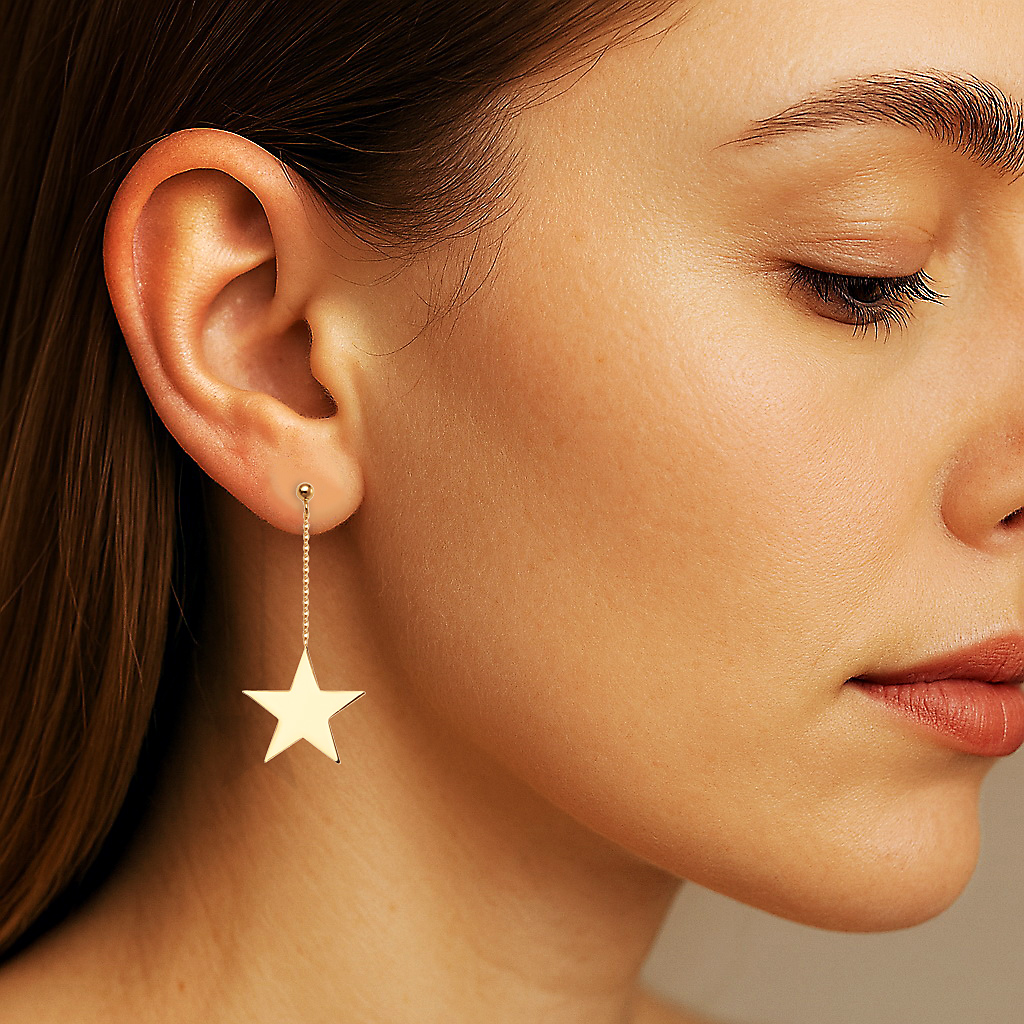 Nowoczesne, wiszące kolczyki w kształcie gwiazdek, wykonane z pozłacanego srebra próby 0,925. Lekka forma i subtelny połysk sprawiają, że są idealnym dodatkiem dla kobiet ceniących wyrazistą, ale nienachalną biżuterię. Gwiazdki zawieszone na delikatnym łańcuszku pięknie poruszają się przy każdym ruchu, dodając stylizacji lekkości i blasku.