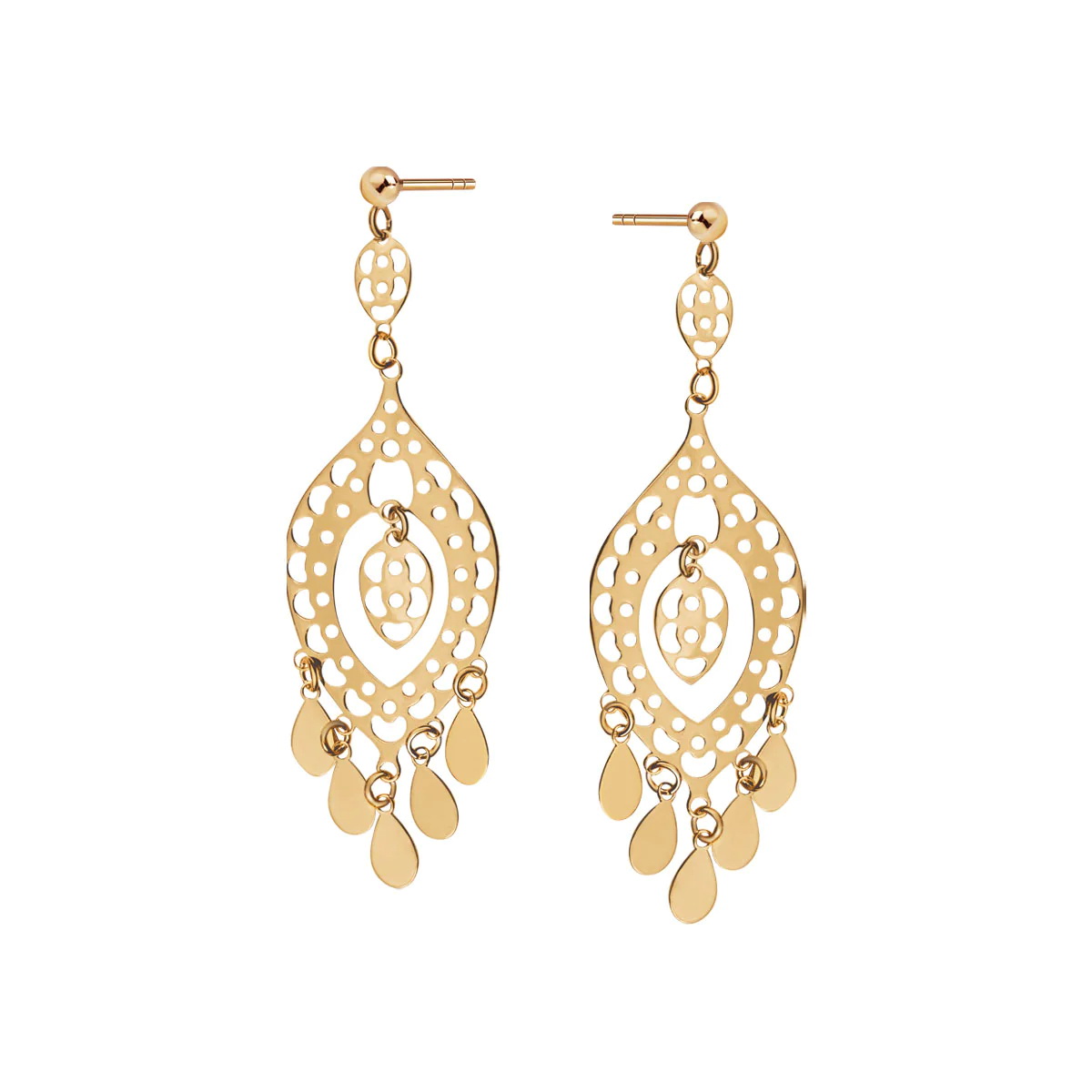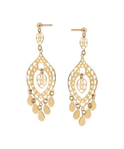 Efektowne kolczyki w stylu BOHO, wykonane ze srebra próby 0,925 i pokryte żółtym złotem. Ażurowa forma w kształcie łezki z drobnymi zawieszkami wprowadza lekkość i swobodny charakter. Ruchome elementy pięknie połyskują przy każdym kroku, dodając całości życia i energii. Idealne dla kobiet kochających styl boho, niezależność i oryginalność w biżuterii.