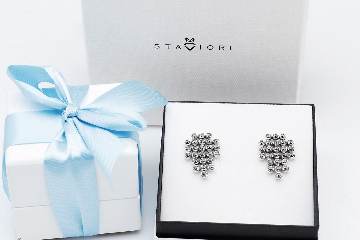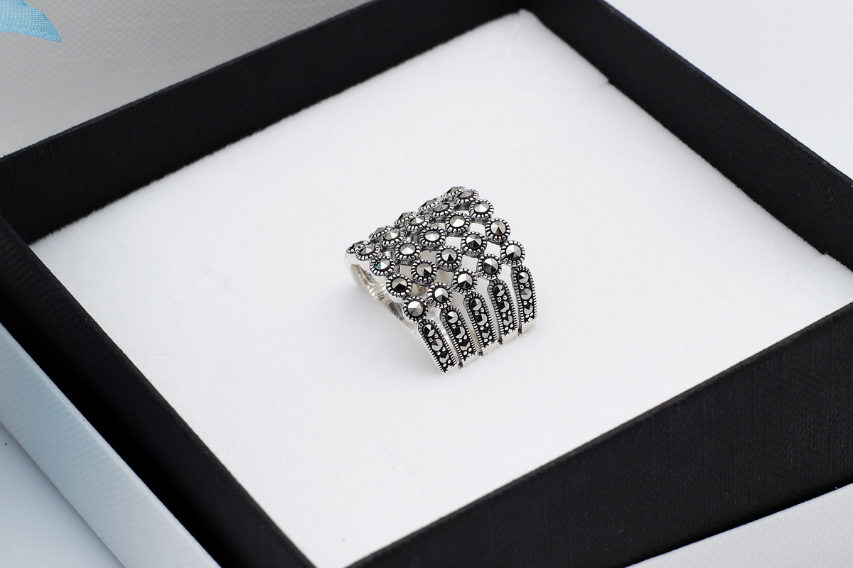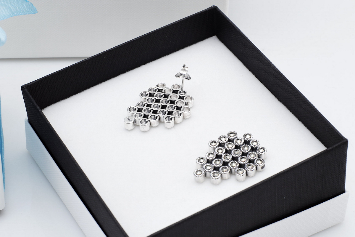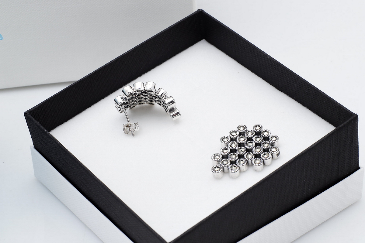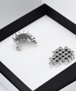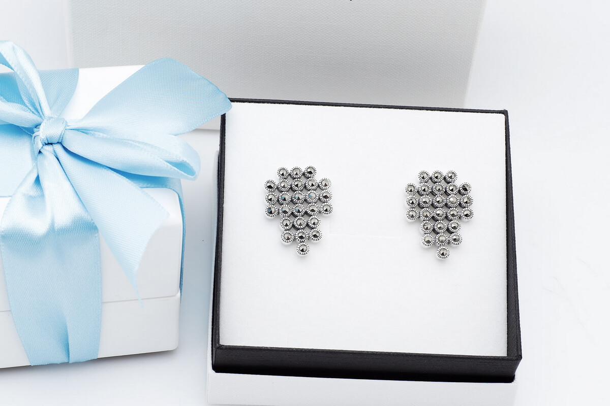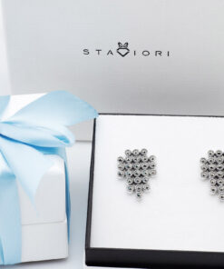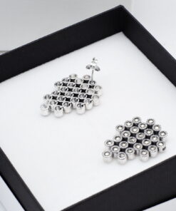 Imponujące kolczyki wykonane ze srebra 0,925 to prawdziwa perełka w stylu retro. Złożone z misternie rozmieszczonych markazytów, tworzą efektowny wzór przypominający winogrona lub koronkowy ornament. Ich wyrazista forma i piękny połysk sprawiają, że są idealnym wyborem na wieczorne wyjścia i eleganckie przyjęcia. Biżuteria, która przyciąga spojrzenia i podkreśla wyjątkowy styl właścicielki.