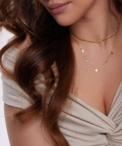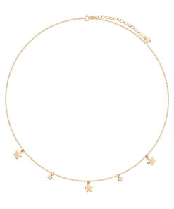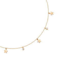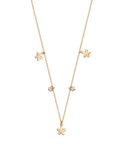 Uroczy naszyjnik wykonany ze srebra próby 0,925, pokryty żółtym złotem, ozdobiony drobnymi zawieszkami w kształcie kwiatków oraz lśniącymi cyrkoniami. Delikatny łańcuszek i subtelne motywy kwiatowe sprawiają, że biżuteria wygląda lekko i dziewczęco, doskonale rozświetlając dekolt. Regulowana długość pozwala dopasować naszyjnik do każdej stylizacji, zarówno na co dzień, jak i na wyjątkowe okazje. Idealny wybór dla kobiet ceniących modny styl i kobiece detale.