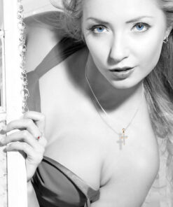 Uroczy wisiorek w kształcie krzyżyka wykonany z żółtego i białego złota próby 0,585. Subtelnie ozdobiony 17 lśniącymi diamentami o łącznej masie 0,10 ct, zachwyca elegancją i duchowym znaczeniem. Idealnie wypolerowane złoto oraz delikatne detale sprawiają, że ten krzyżyk pięknie mieni się w świetle, będąc symbolem wiary i ponadczasowego stylu. Doskonały pomysł na wyjątkowy prezent, który będzie towarzyszył każdego dnia.