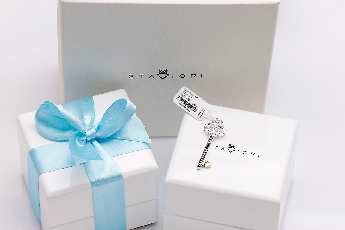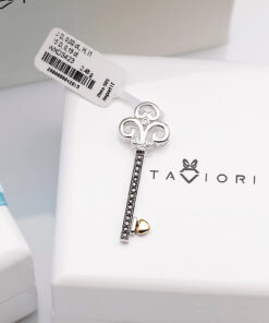 Zachwycający wisiorek w kształcie kluczyka wykonany z połączenia białego i żółtego złota próby 0,585. Udekorowany 15 czarnymi oraz 3 białymi diamentami o łącznej masie 0,21 ct, urzeka niezwykłym kontrastem barw i finezyjnym wzornictwem. Symboliczny klucz do serca to nie tylko elegancka ozdoba, ale także wyraz uczuć i wyjątkowej więzi. Doskonały prezent dla kobiety, która ceni oryginalność i klasę.