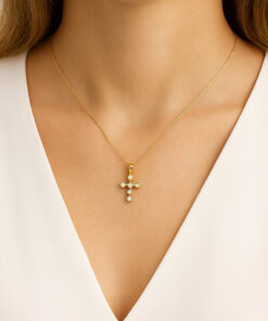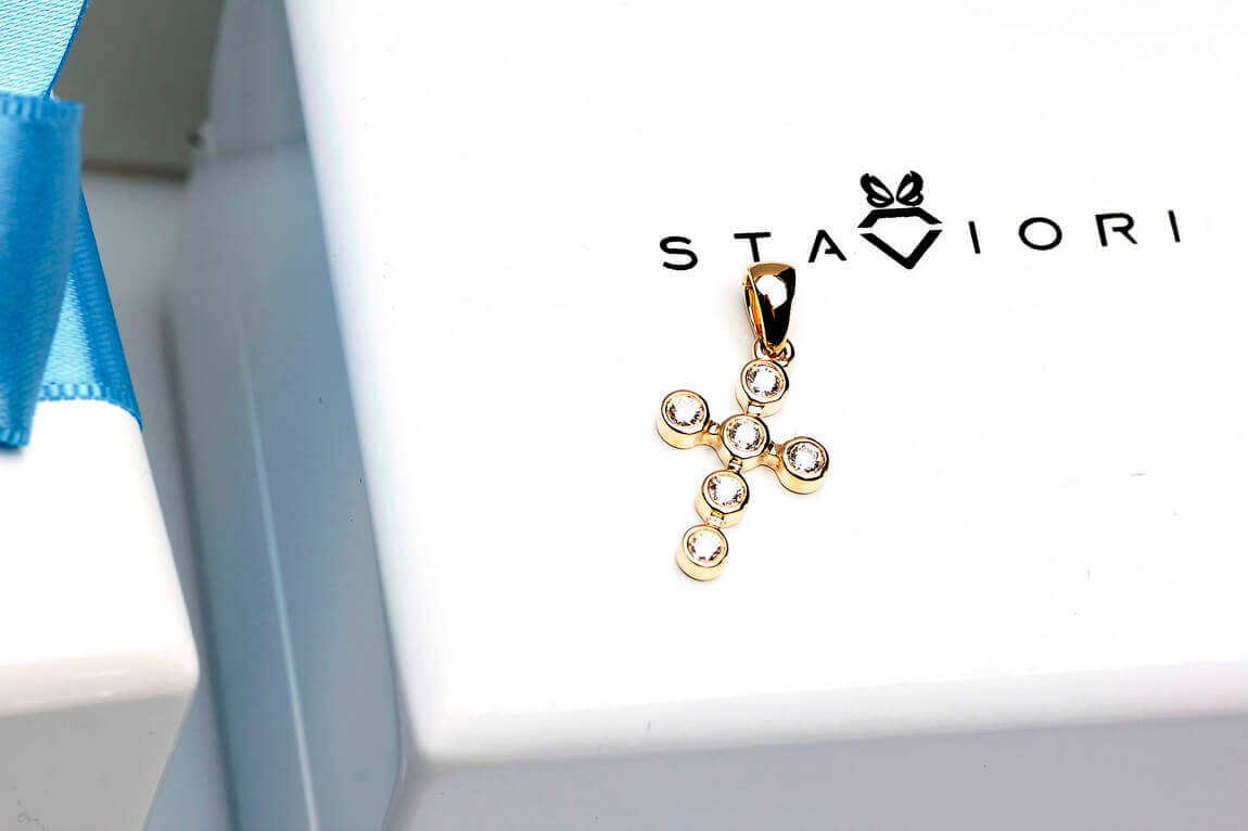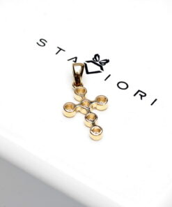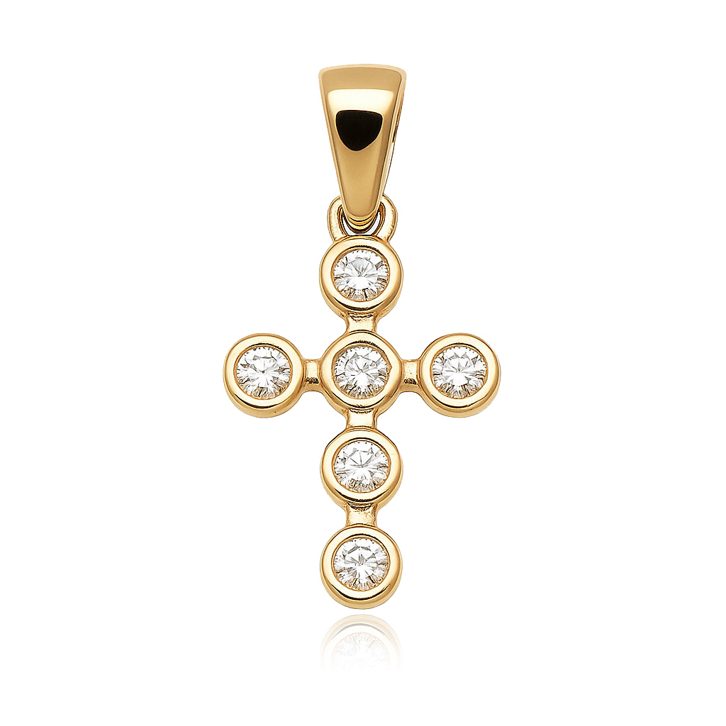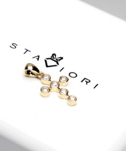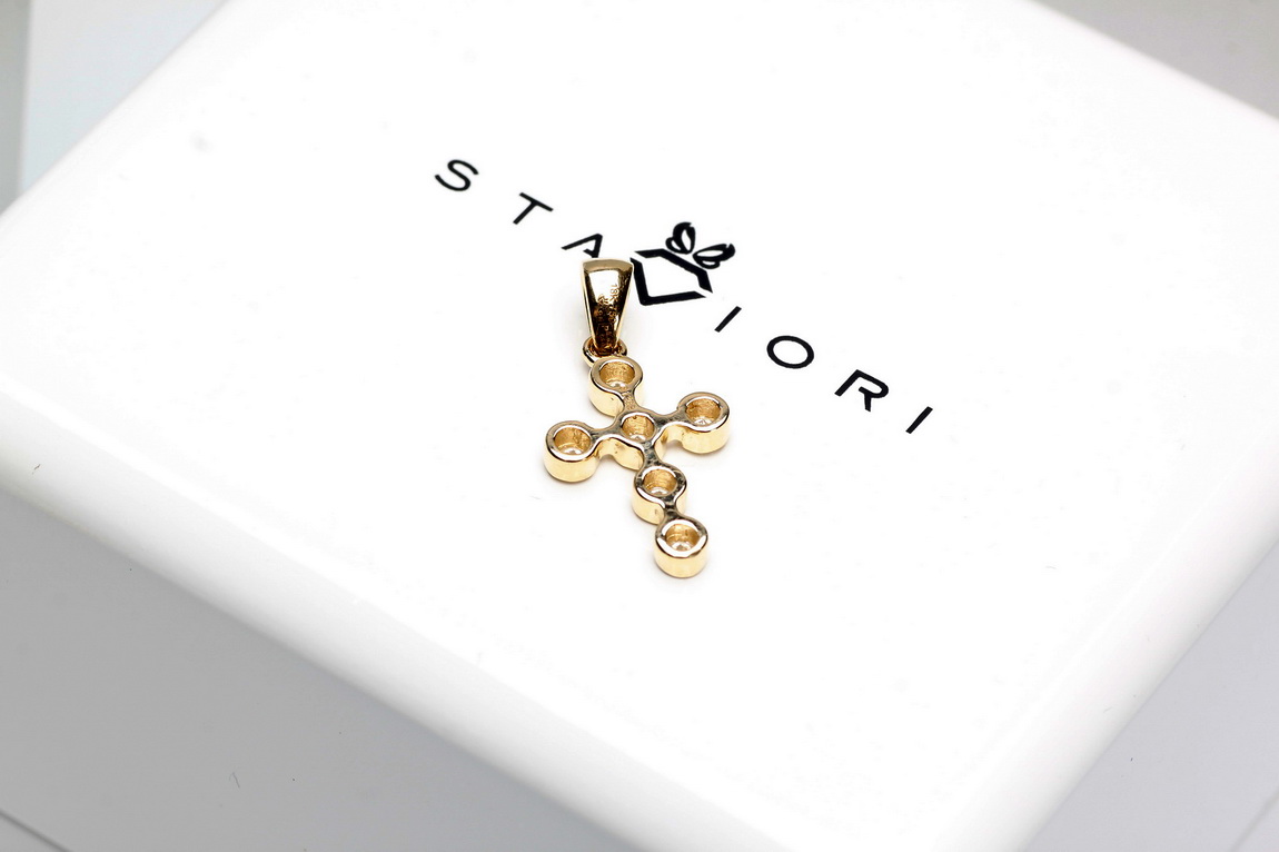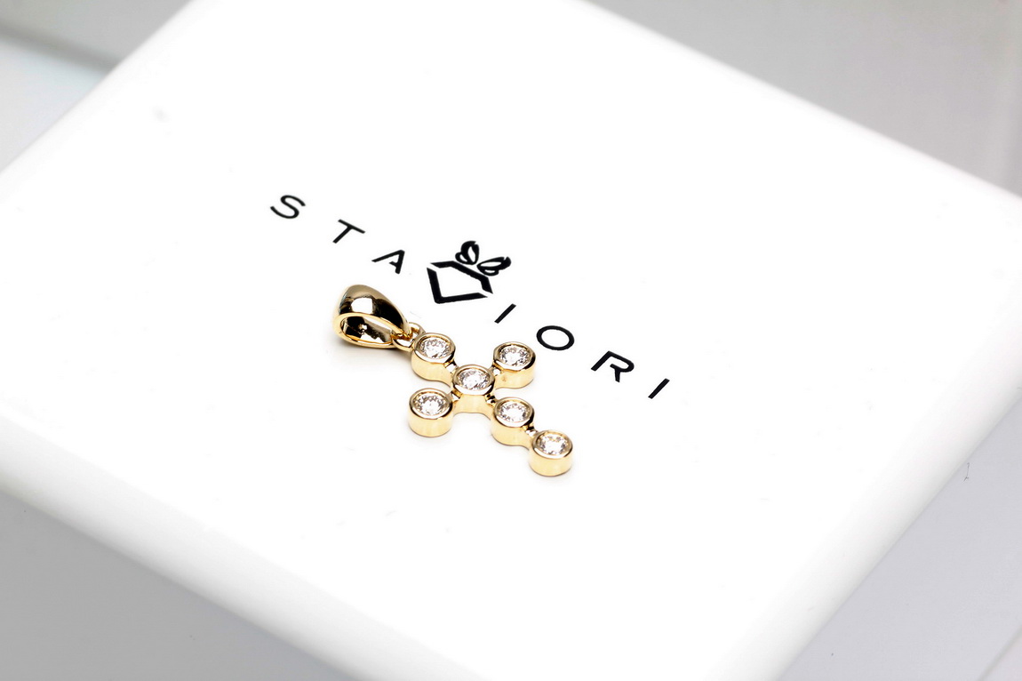 Wyjątkowy krzyżyk wykonany z najwyższej jakości żółtego złota próby 0,750 to elegancka biżuteria o symbolicznym znaczeniu. Sześć lśniących diamentów o łącznej masie 0,18 ct subtelnie podkreśla blask całości, tworząc efektowną kompozycję. Klasyczna forma krzyżyka zachwyca precyzją wykonania i ponadczasową estetyką. To doskonały wybór zarówno na prezent, jak i jako wyraz własnej wiary i stylu. Krzyżyk można zamówić także w białym złocie.