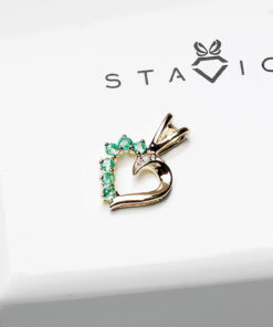Wyjątkowy wisiorek w kształcie serca wykonany z żółtego złota 0,585, ozdobiony sześcioma naturalnymi szmaragdami i subtelnym diamentem. Połączenie intensywnej zieleni szmaragdów i blasku złota tworzy niezwykle kobiecą i elegancką kompozycję. Delikatny diament dodaje całości wyjątkowego uroku i klasy. To doskonały wybór na prezent dla bliskiej osoby lub piękne uzupełnienie codziennych stylizacji.
