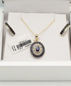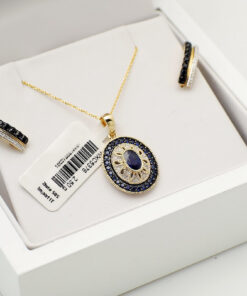 Zachwycający wisiorek z żółtego złota 0,585, ozdobiony głębokimi granatowymi szafirami oraz subtelnymi diamentami. Centralny szafir w szlifie owalnym otoczony jest błyszczącymi kamieniami, tworząc niezwykle efektowną kompozycję o bogatym, królewskim charakterze. Biżuteria pełna klasy i blasku, idealna dla kobiet ceniących elegancję i wyrafinowanie.