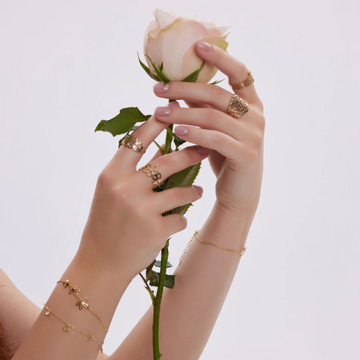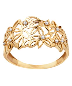 Uroczy pierścionek z żółtego złota, ozdobiony delikatnym ażurowym wzorem w kształcie kwiatów i liści. Każdy detal został starannie dopracowany, a błyszczące cyrkonie subtelnie podkreślają lekkość i romantyczny charakter biżuterii. Idealny wybór dla kobiet ceniących subtelną elegancję i naturę zaklętą w złocie.