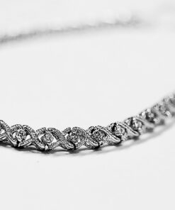 A delicate 14K white gold bracelet measuring 18cm in length and a subtle 3.8mm in width, set with 38 sparkling diamonds weighing a total of 0.92 ct. Each diamond of G-H colour and SI1 clarity has been intricately set, creating the effect of a slightly shimmering sheet of light around the wrist. Classic form meets modern precision craftsmanship here, making this bracelet an exceptional accessory for evening and everyday styling.