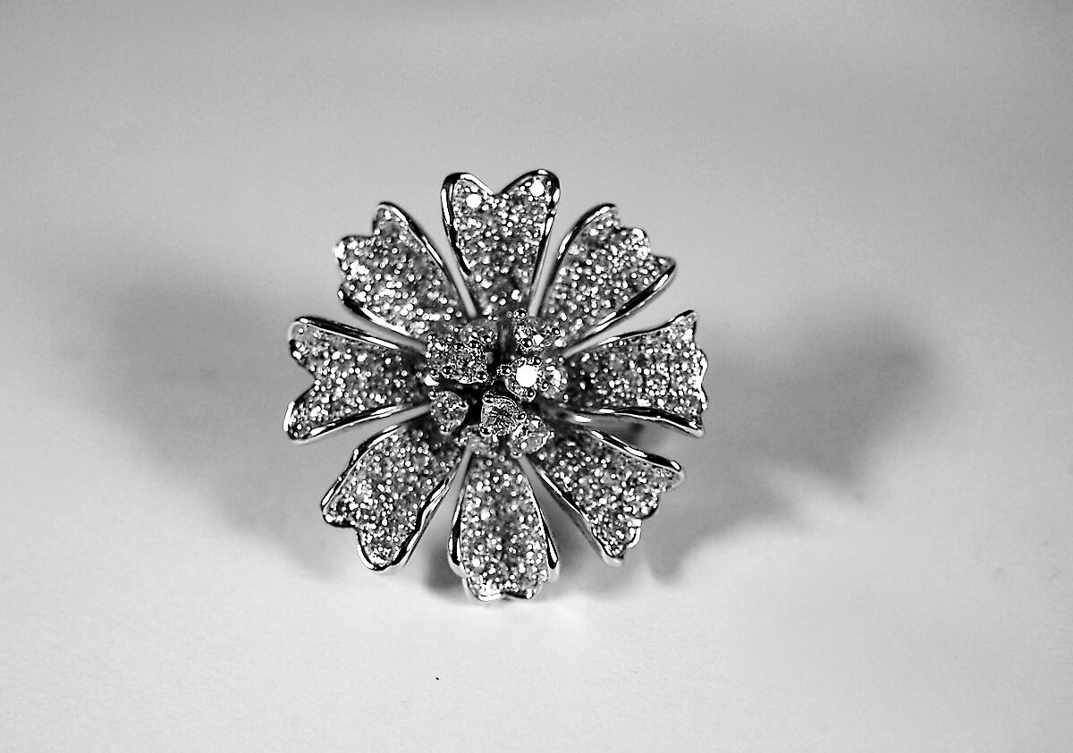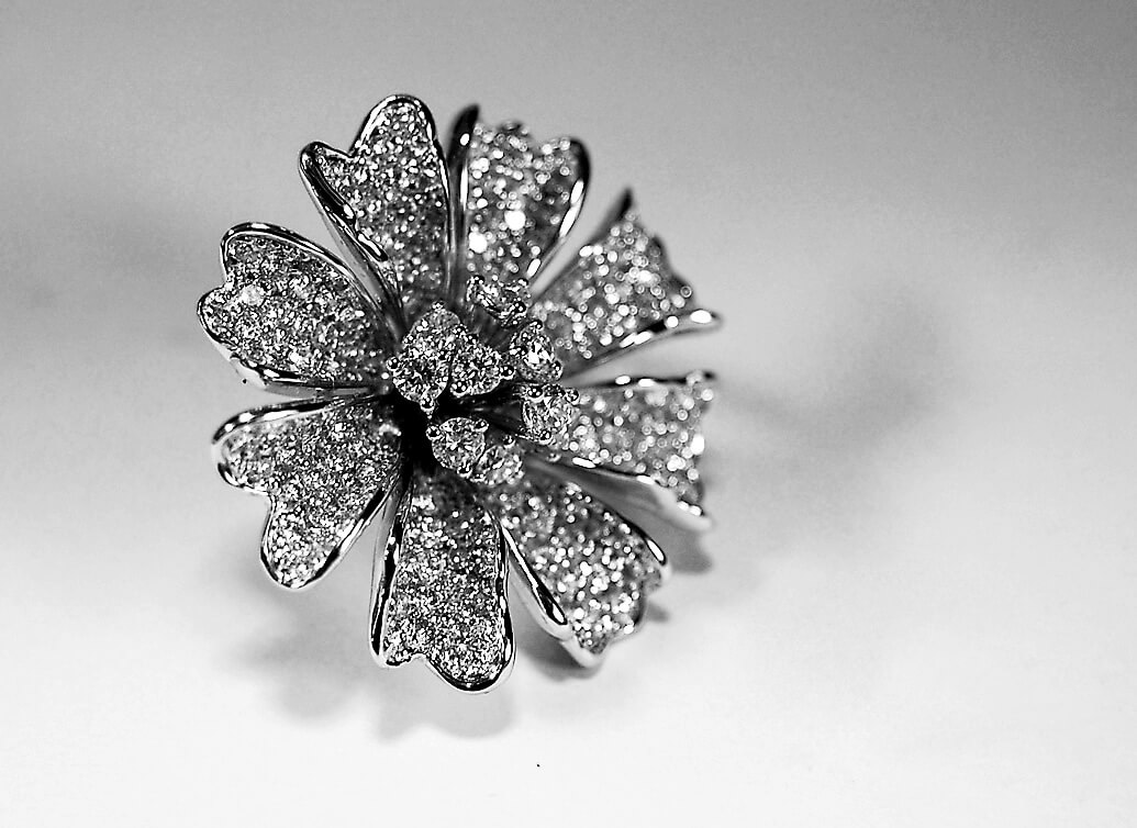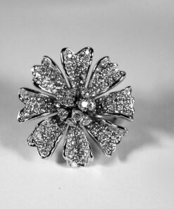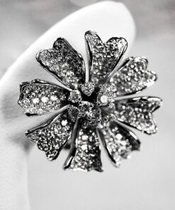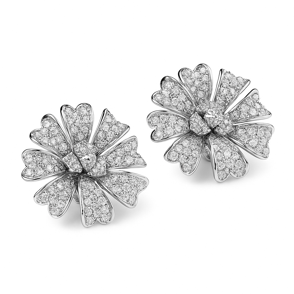 Delightful earrings in the shape of a blooming flower, made of the highest quality white gold 750. The whole was intricately adorned with up to 332 diamonds weighing a total of 3.86 ct, creating an amazing effect of luxury and brilliance. The stones of G-H colour and SI1 clarity subtly reflect the light, giving the earrings exceptional elegance. Thanks to a sturdy clip clasp with an additional safety pin, the jewellery stays firmly and comfortably on the ear. This is the perfect choice for the most special occasions.