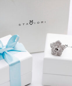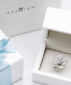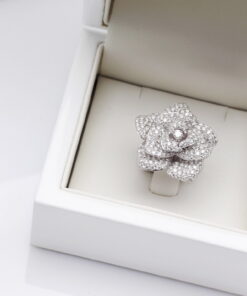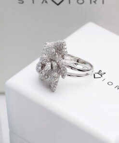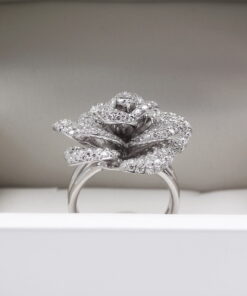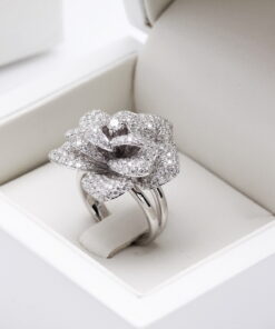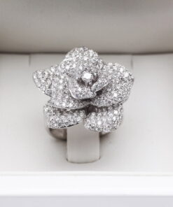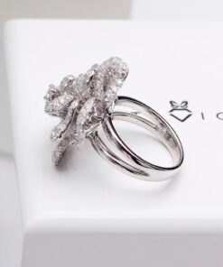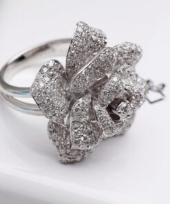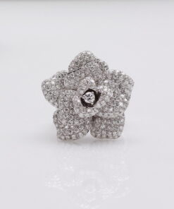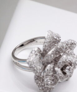 Phenomenal ring in 0.750 white gold, which dazzles with its form and brilliance. The beautiful spatial flower motif was intricately set with as many as 260 diamonds weighing a total of 2.54 ct. Every detail of this piece of jewellery is stunning - from the artfully shaped petals to the elegant double rail. This is a spectacular ring that combines luxury with artistic sophistication. Perfect for women who love unique and striking accessories.