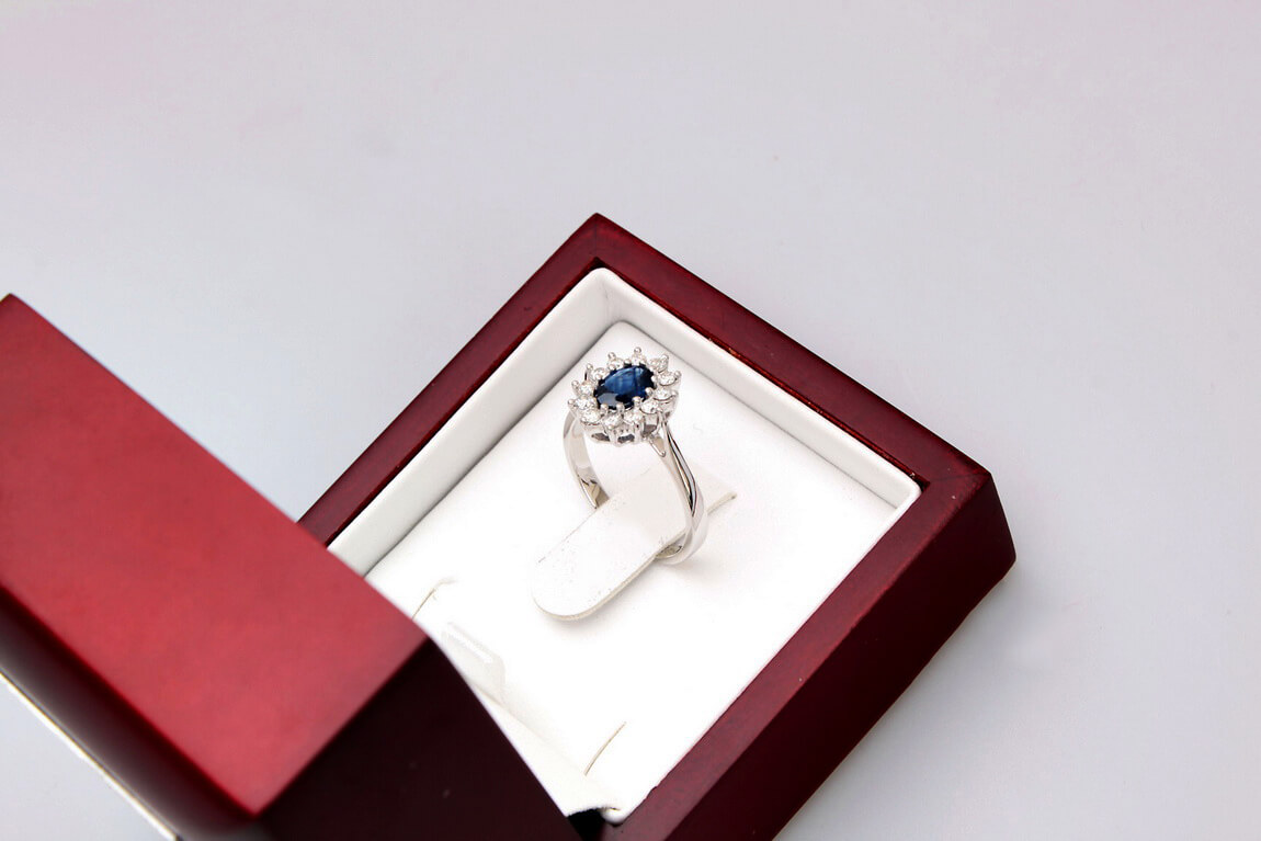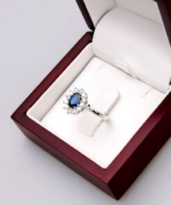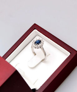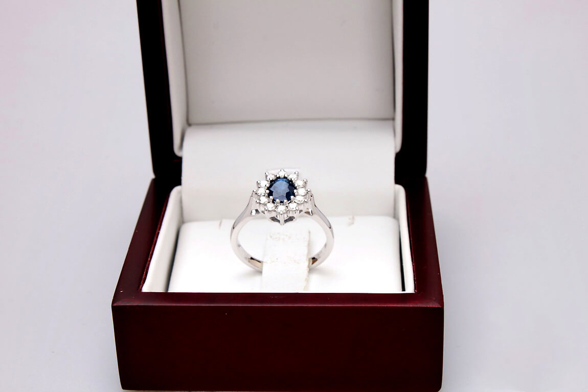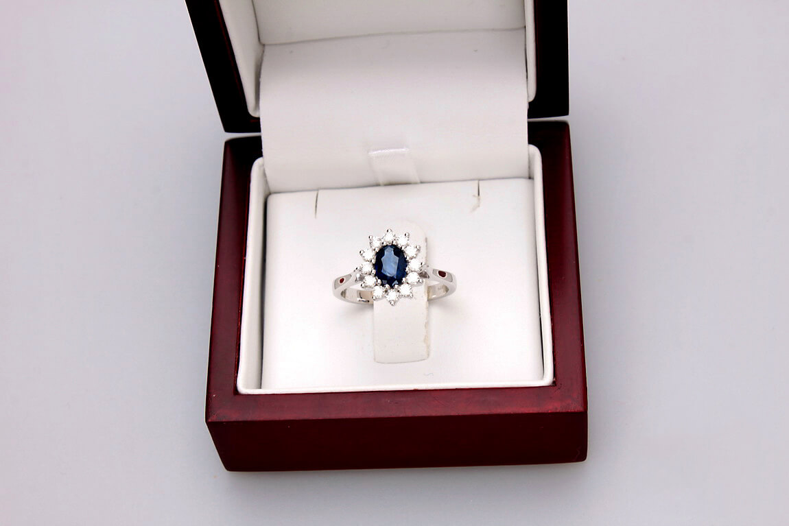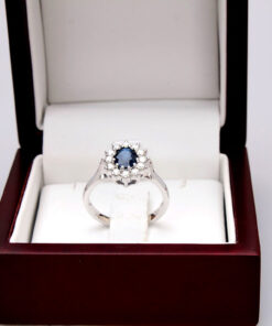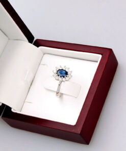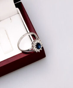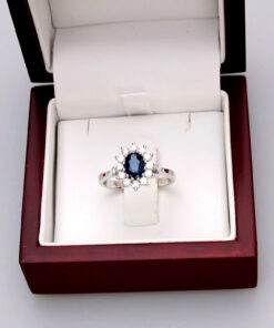 A stunning 0.585 white gold ring featuring a majestic 0.95 ct sapphire surrounded by twelve diamonds weighing a total of 0.51 ct. The stones form a classic royal-style composition, evoking the famous rings of royal families. With its harmonious form and craftsmanship, this model exudes luxury and timeless elegance. Ideal as a unique engagement ring or a gift for a very special occasion.