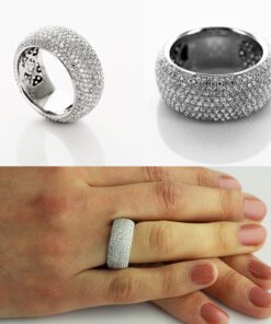 A dazzling ring in 0.750 white gold, set entirely with as many as 495 diamonds weighing a total of 3.33 ct. Thanks to the dense pavé of diamonds in G-H colour and SI1 clarity, the entire surface of the ring impresses with spectacular brilliance. The wide profile gives it a distinctive and luxurious feel. This is jewellery for women who love prestige and unique style.