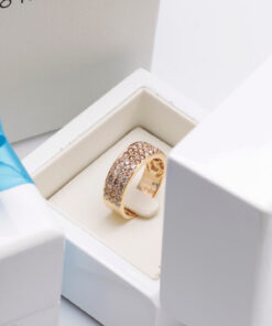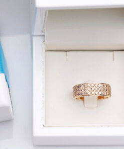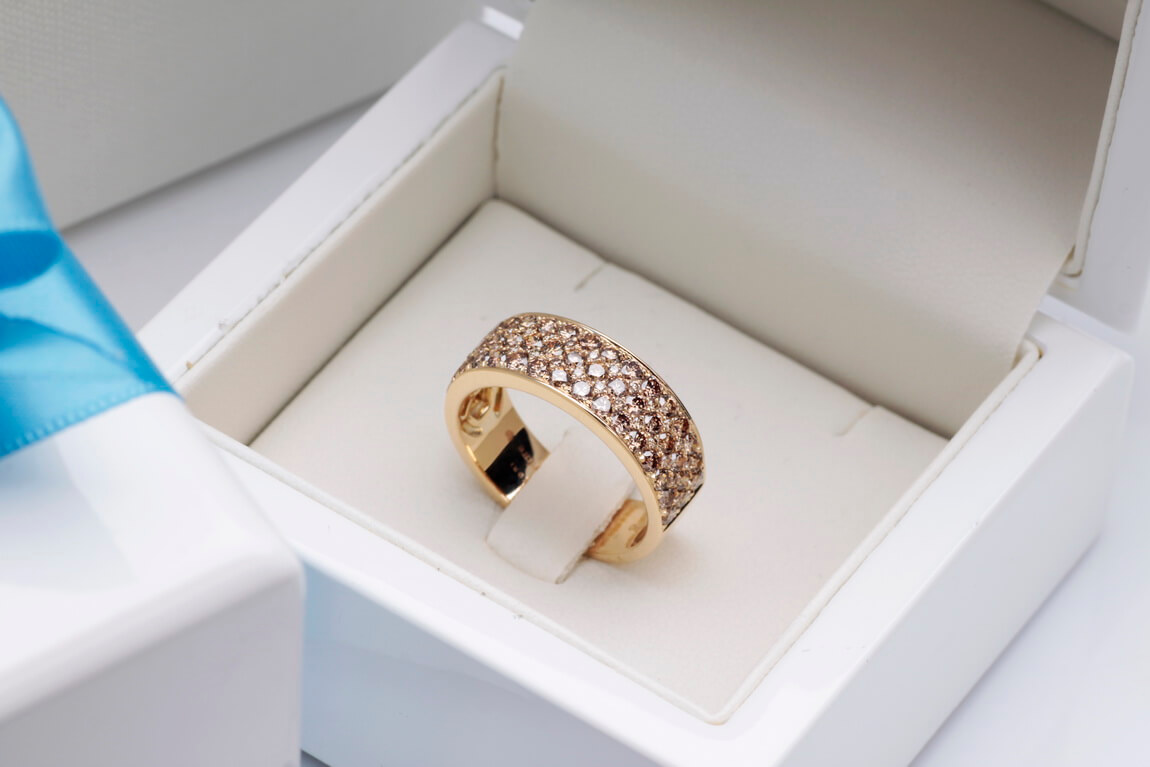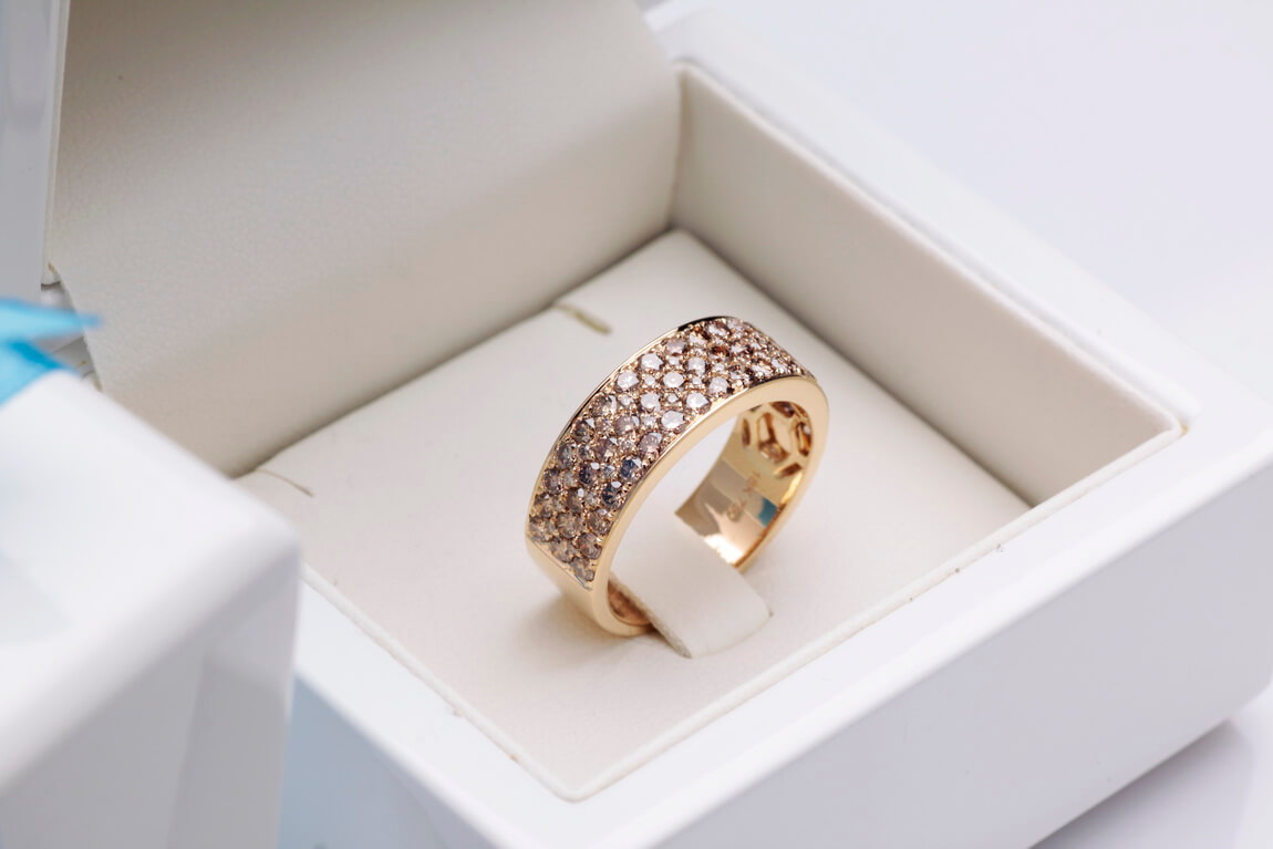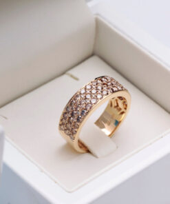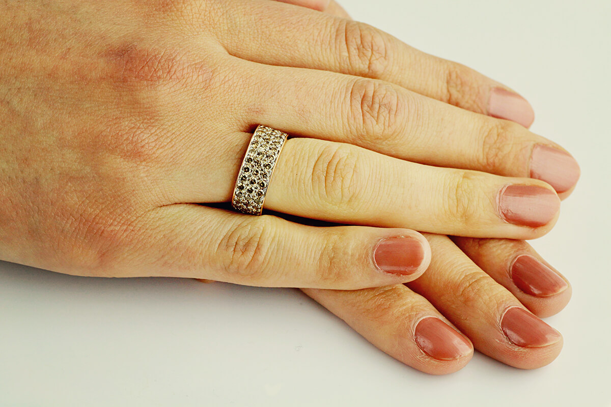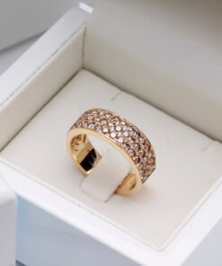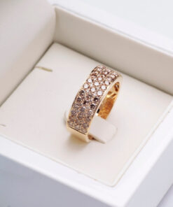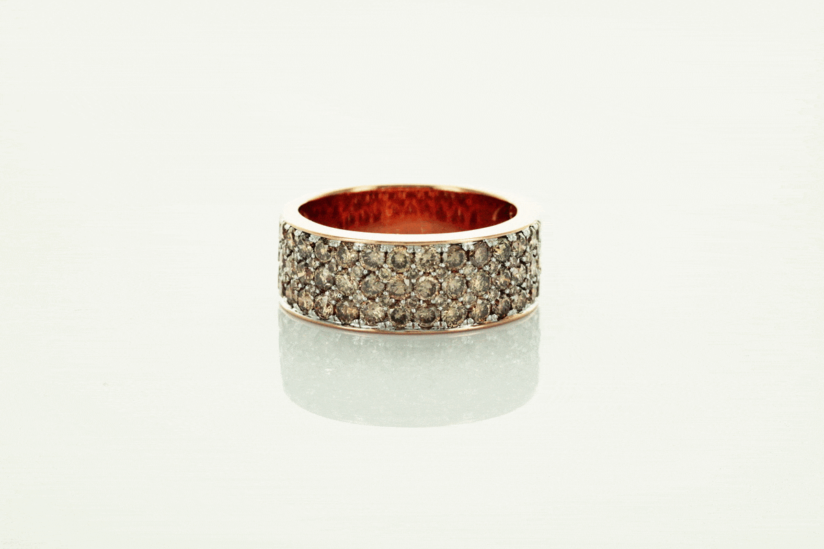 A stunning 0.750 rose gold ring set with up to 83 champagne diamonds weighing a total of 1.95 ct. The wide ring sparkles with the richness of the stones, creating a spectacular effect of brilliance and elegance. This is a distinctive and bold design that catches the eye and adds a luxurious touch to any look. An ideal choice for women who appreciate jewellery full of sparkle and class.