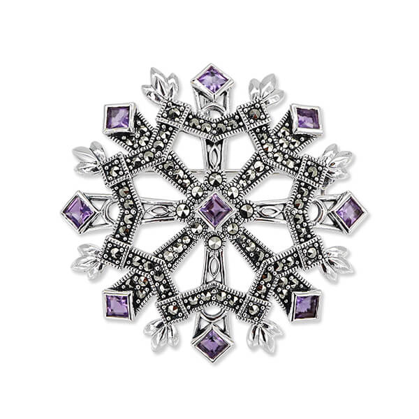 A delightful brooch in the shape of a snowflake, made of sterling silver and adorned with sparkling marcasites and purple amethysts. Every detail of this jewellery exudes elegance and precision, creating an extremely impressive composition with a wintry, regal feel. The brooch can also be worn as a pendant - a perfect choice for lovers of unique ornaments with a vintage soul.