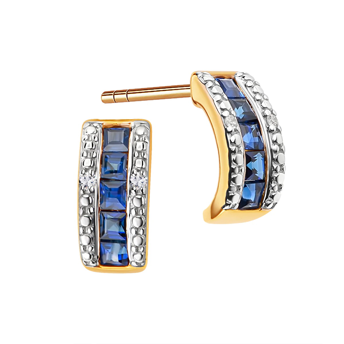 Subtelne i niezwykle eleganckie kolczyki wykonane z żółtego złota próby 585, które zachwycają precyzją wykonania. Sercem projektu jest harmonijne połączenie dziesięciu głębokich szafirów z delikatnym blaskiem czterech diamentów w szlifie ósemkowym. Klasyczna forma sztyftu zapewnia komfort noszenia, a kontrast między ciepłym odcieniem złota a królewskim błękitem szafirów nadaje biżuterii wyrazistego charakteru. To idealny wybór dla kobiet ceniących ponadczasowy styl i wyrafinowane detale.