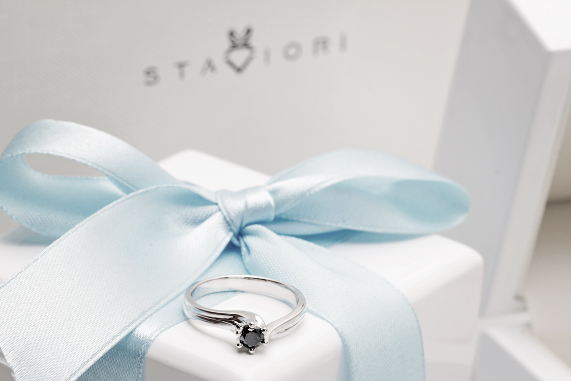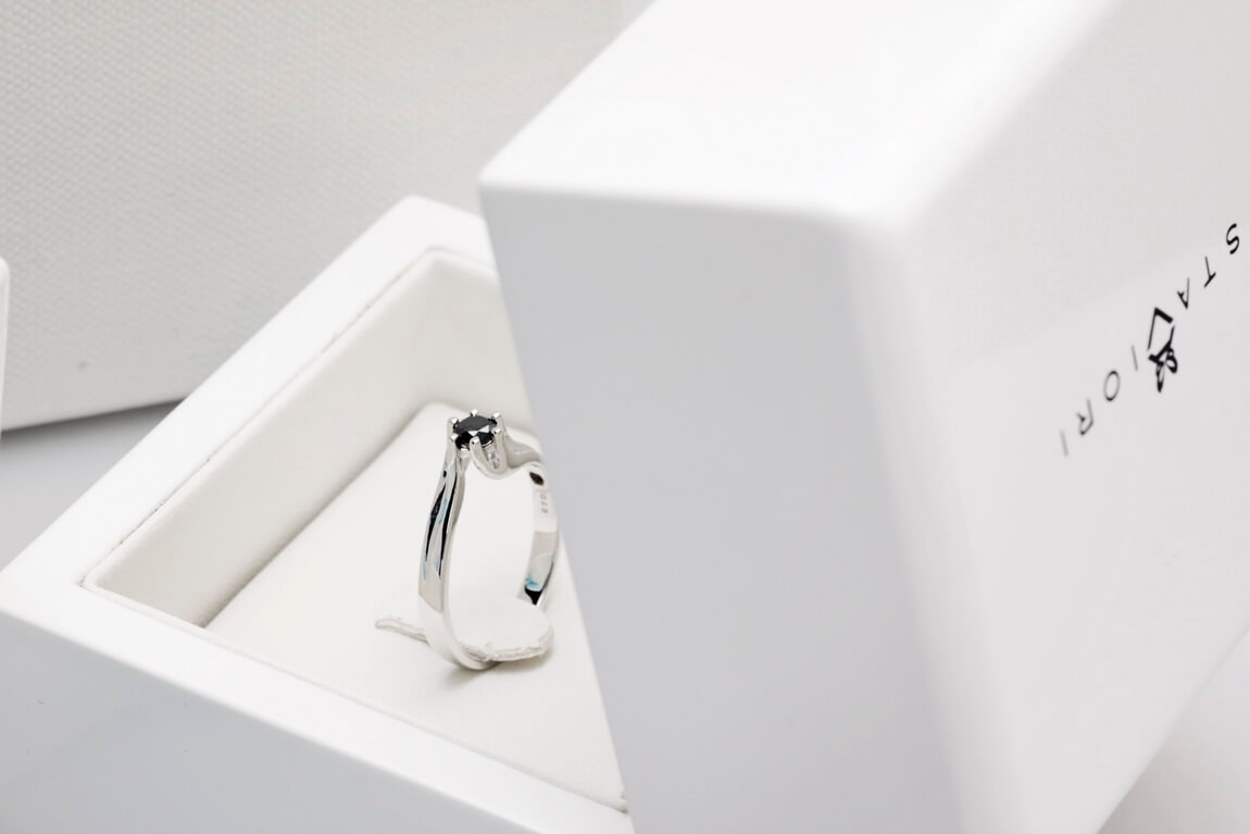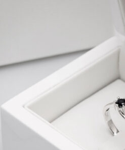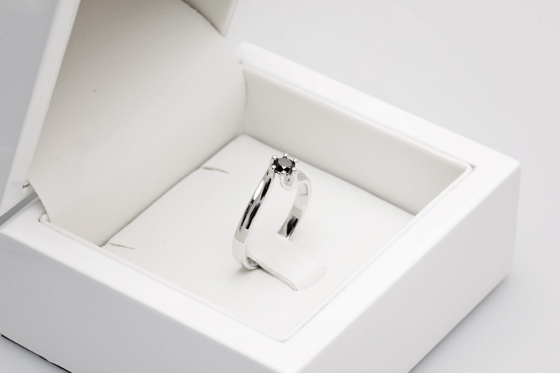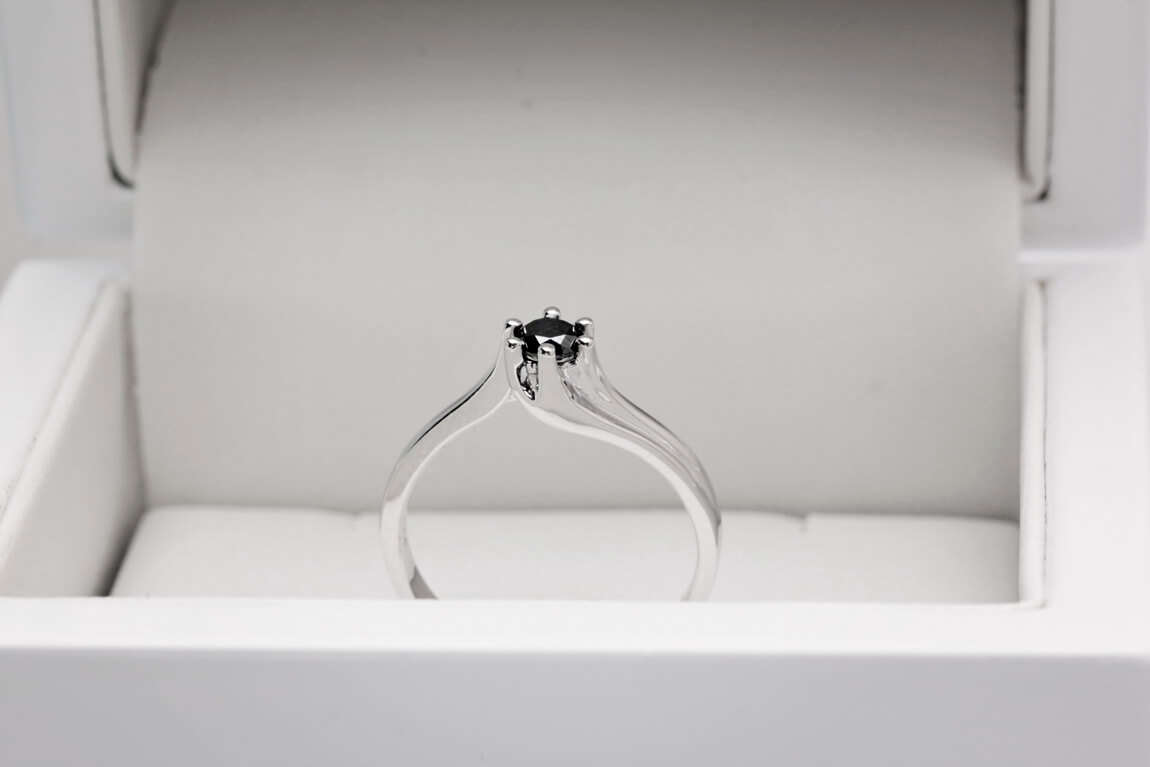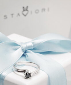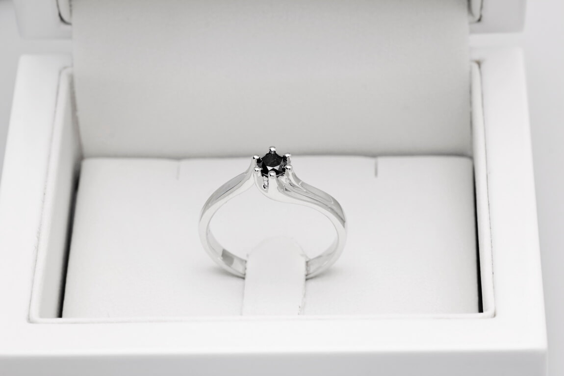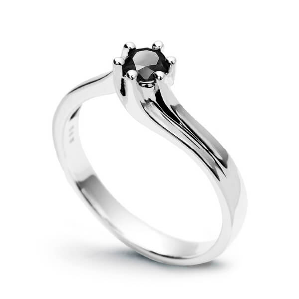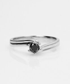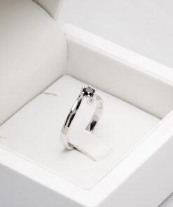Elegancki pierścionek zaręczynowy z białego złota próby 0,585, zdobiony wyjątkowym czarnym diamentem o masie 0,25 ct. Klasyczna korona z sześcioma łapkami pięknie eksponuje kamień, a delikatnie skręcona szyna nadaje całości nowoczesny, a zarazem subtelny charakter. To doskonały wybór dla osób poszukujących oryginalności i ponadczasowej elegancji.
