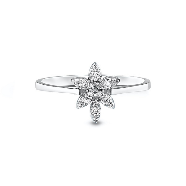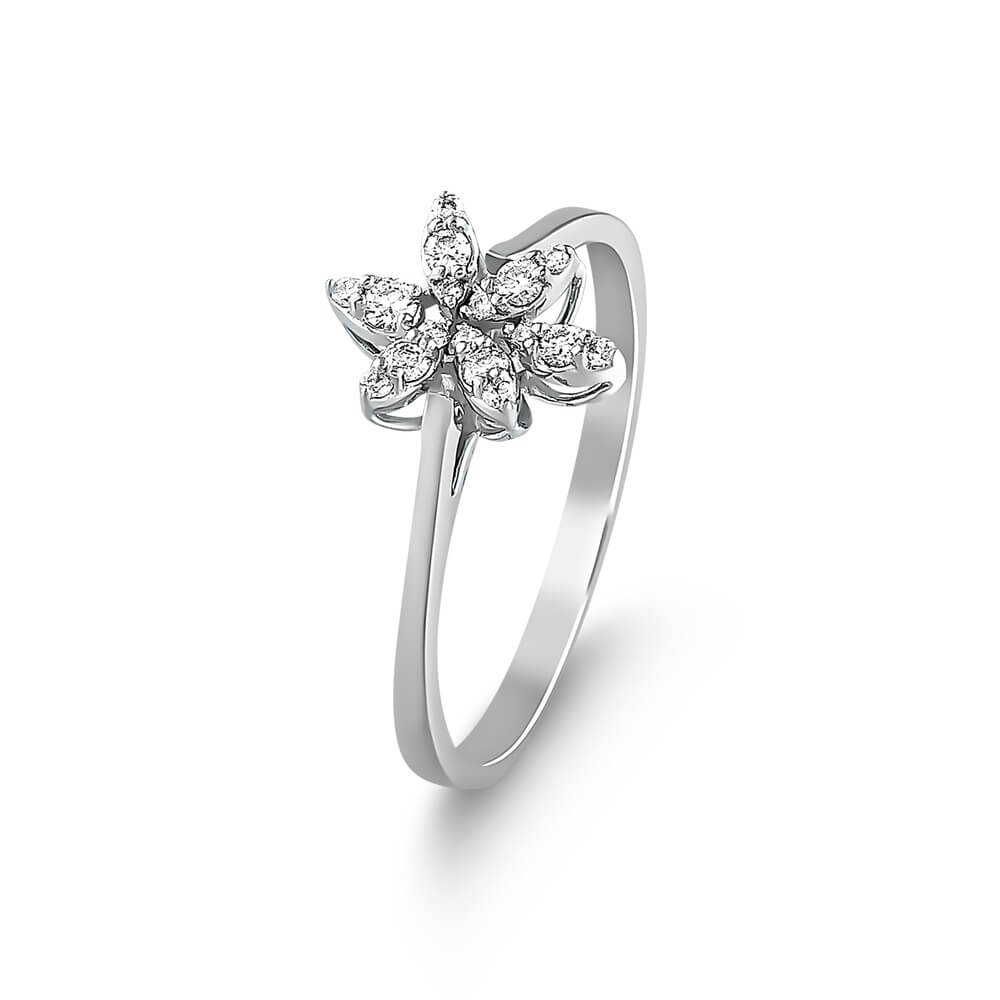 Uroczy pierścionek z białego złota próby 0,750, którego sercem jest kwiatowy motyw uformowany z 17 diamentów w szlifie brylantowym (o łącznej masie 0,14 ct). Delikatna obrączka i misternie ułożone płatki tworzą harmonijną całość, pełną kobiecego wdzięku i subtelnego blasku. Idealna propozycja dla miłośniczek biżuterii inspirowanej naturą – romantyczna, lekka i olśniewająca.