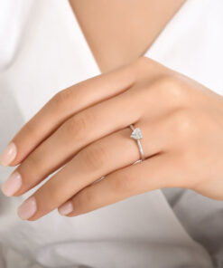Olśniewający pierścionek z 18-karatowego białego złota, którego serce tworzą dwa diamenty o szlifie gruszkowym i jeden centralny brylant. Kamienie ułożone w subtelny kształt serca symbolizują głęboką więź i prawdziwe uczucie. Wyjątkowa kompozycja o delikatnym, ale wyrazistym charakterze to doskonały wybór na zaręczyny lub romantyczny prezent. Dostępny także w innych kolorach złota – dla pełnej personalizacji.